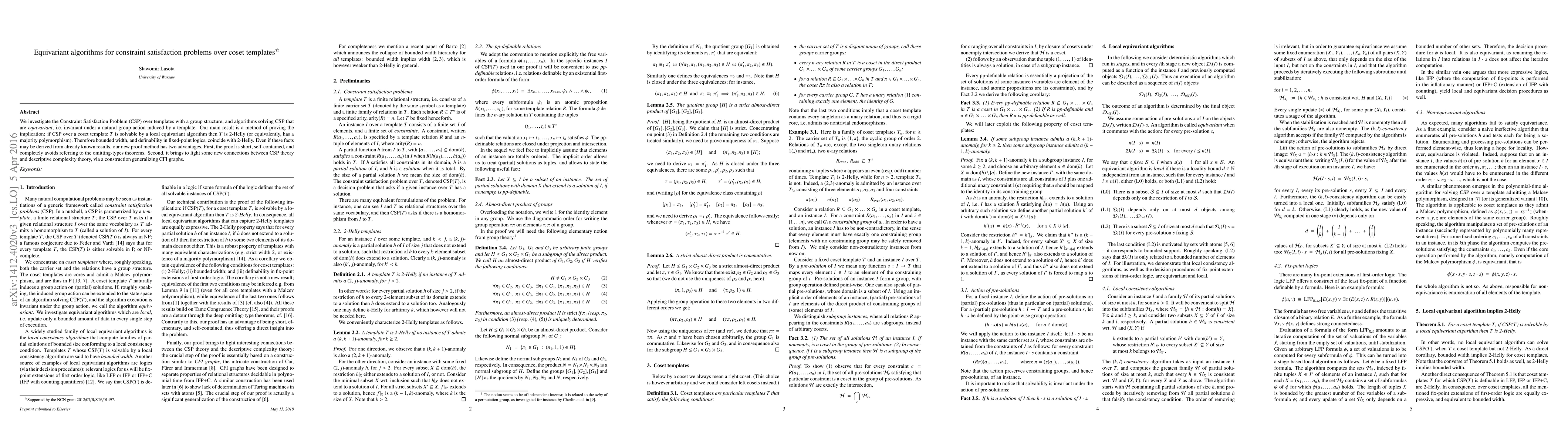 This paper develops equivariant algorithms for solving Constraint Satisfaction Problems (CSP) over group-structured templates, proving that CSP solvability implies 2-Helly property. The study highlights new connections between CSP and descriptive complexity, offering a concise, self-contained proof without relying on omitting-types theorems.