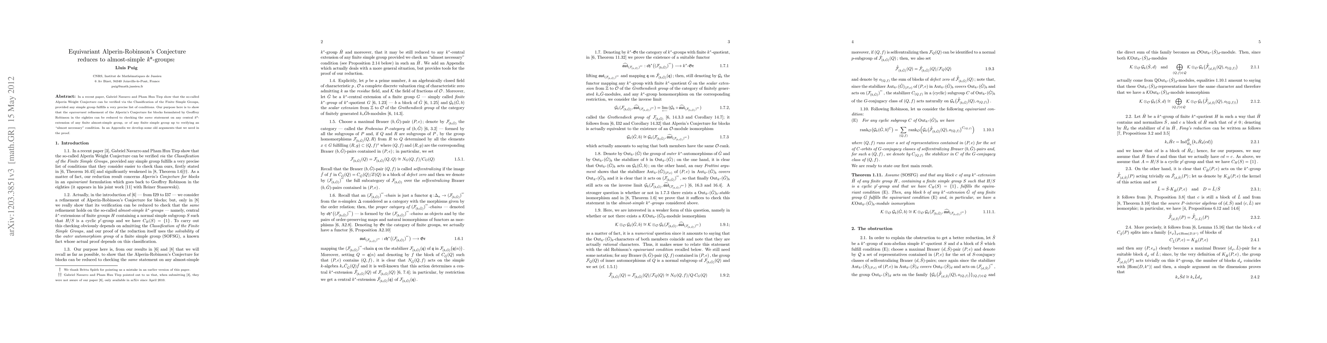 In a recent paper, Gabriel Navarro and Pham Huu Tiep show that the so-called Alperin Weight Conjecture can be verified via the Classification of the Finite Simple Groups, provided any simple group fulfills a very precise list of conditions. Our purpose here is to show that the equivariant refinement of the Alperin's Conjecture for blocks formulated by Geoffrey Robinson in the eighties can be reduced to checking the same statement on any central k*-extension of any finite almost-simple group, or of any finite simple group up to verifying an "almost necessary" condition. In an Appendix we develop some old arguments that we need in the proof.