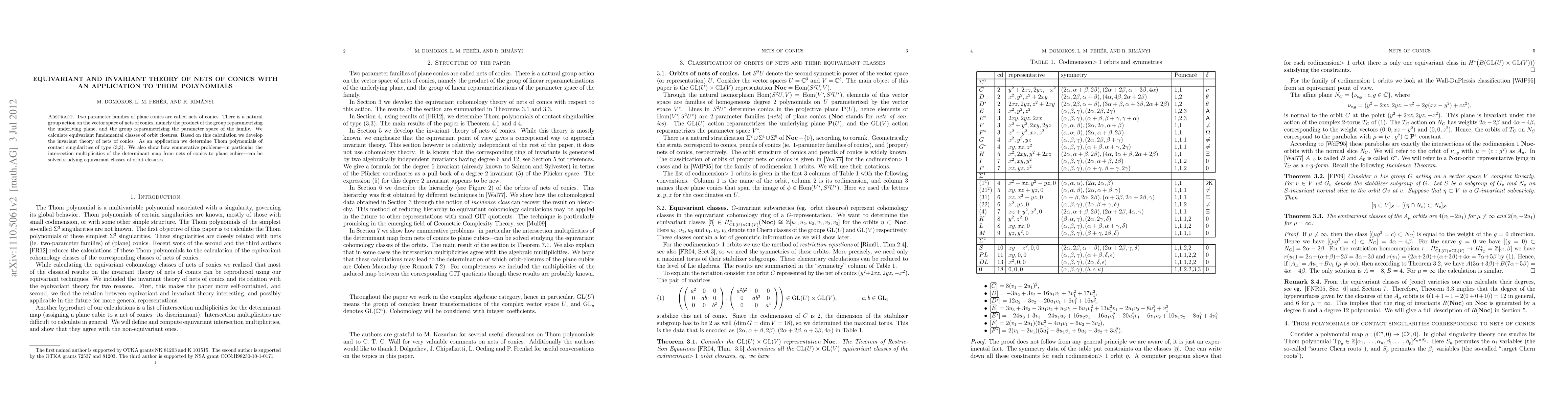 Two parameter families of plane conics are called nets of conics. There is a natural group action on the vector space of nets of conics, namely the product of the group reparametrizing the underlying plane, and the group reparametrizing the parameter space of the family. We calculate equivariant fundamental classes of orbit closures. Based on this calculation we develop the invariant theory of nets of conics. As an application we determine Thom polynomials of contact singularities of type (3,3). We also show how enumerative problems---in particular the intersection multiplicities of the determinant map from nets of conics to plane cubics---can be solved studying equivariant classes of orbit closures.