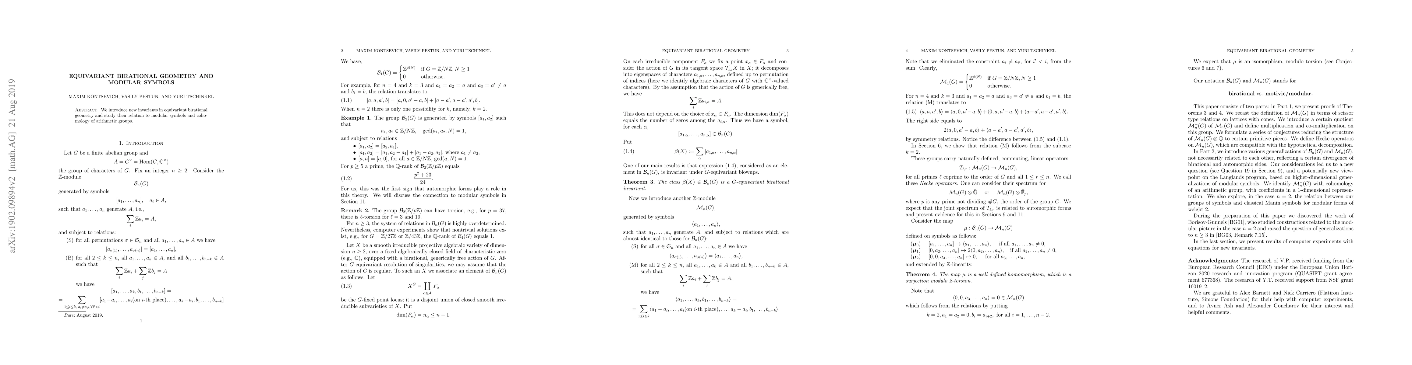 The paper introduces new invariants in equivariant birational geometry and studies their relation to modular symbols and cohomology of arithmetic groups, formulating conjectures about the cohomology of certain complexes.