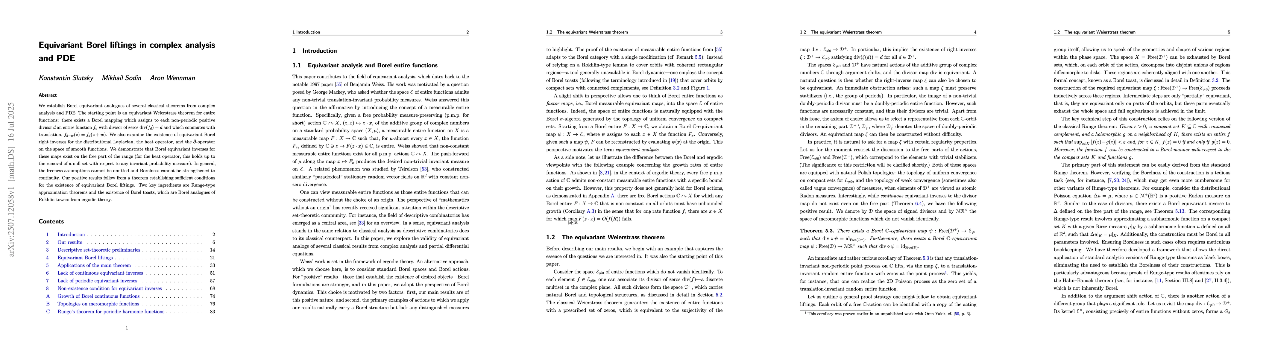 We establish Borel equivariant analogues of several classical theorems from complex analysis and PDE. The starting point is an equivariant Weierstrass theorem for entire functions: there exists a Borel mapping which assigns to each non-periodic positive divisor $d$ an entire function $f_d$ with divisor of zeros $\mathrm{div}(f_d)=d$ and which commutes with translation, $f_{d-w}(z)=f_d(z+w)$. We also examine the existence of equivariant Borel right inverses for the distributional Laplacian, the heat operator, and the $\bar{\partial}$-operator on the space of smooth functions. We demonstrate that Borel equivariant inverses for these maps exist on the free part of the range (for the heat operator, this holds up to the removal of a null set with respect to any invariant probability measure). In general, the freeness assumptions cannot be omitted and Borelness cannot be strengthened to continuity. Our positive results follow from a theorem establishing sufficient conditions for the existence of equivariant Borel liftings. Two key ingredients are Runge-type approximation theorems and the existence of Borel toasts, which are Borel analogues of Rokhlin towers from ergodic theory.