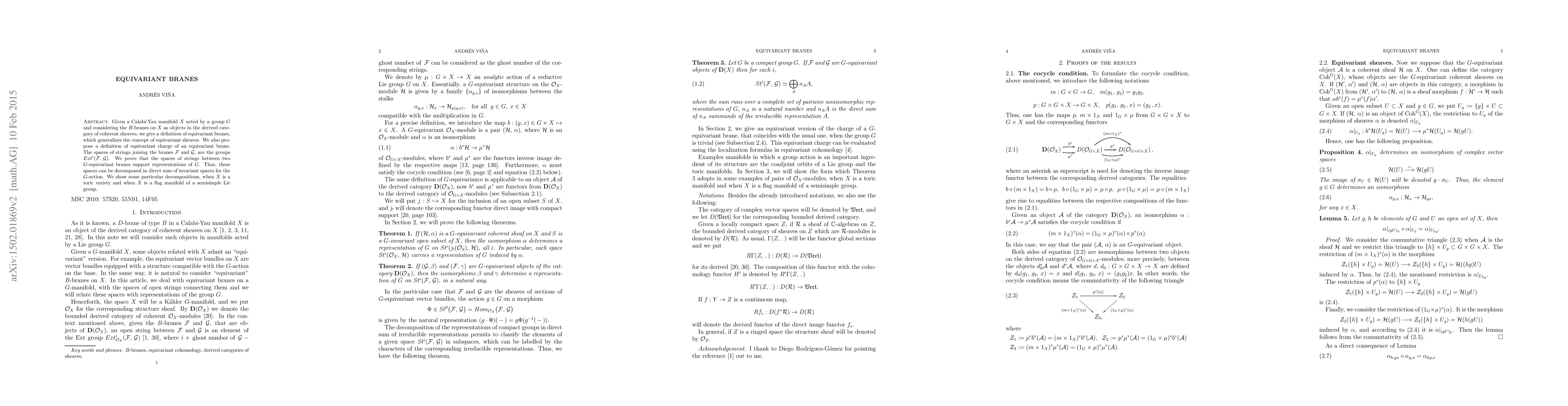 Given a Calabi-Yau manifold $X$ acted by a group $G$ and considering the $B$-branes on $X$ as objects in the derived category of coherent sheaves, we give a definition of equivariant branes, which generalizes the concept of equivariant sheaves. We also propose a definition of equivariant charge of an equivariant brane. The spaces of strings joining the branes ${\mathcal F}$ and ${\mathcal G}$, are the groups $Ext^i({\mathcal F},\,{\mathcal G})$. We prove that the spaces of strings between two $G$-equivariant branes support representations of $G$. Thus, these spaces can be decomposed in direct sum of invariant spaces for the $G$-action. We show some particular decompositions, when $X$ is a toric variety and when $X$ is a flag manifold of a semisimple Lie group.