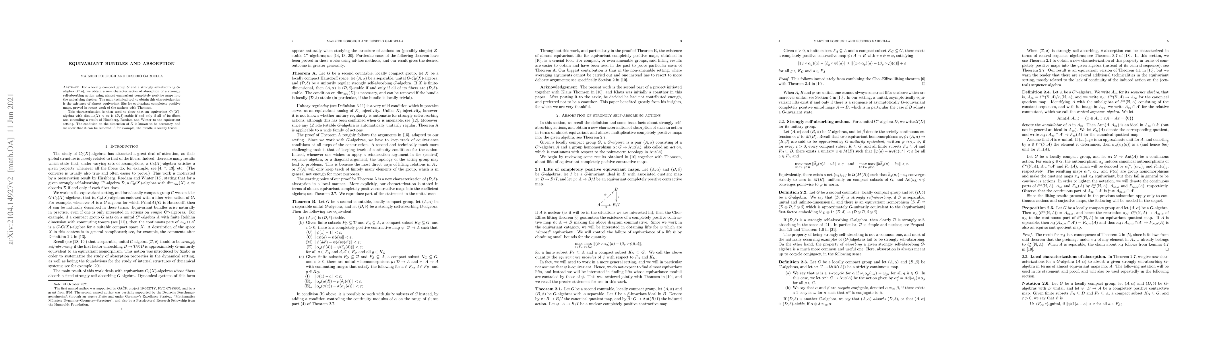This paper characterizes absorption of a strongly self-absorbing $G$-algebra using almost equivariant completely positive maps, extending previous results to the equivariant setting. It also proves that an equivariant $C_0(X)$-algebra is $(\mathcal{D},\delta)$-stable if all fibers are stable, under conditions on the dimension of $X$.