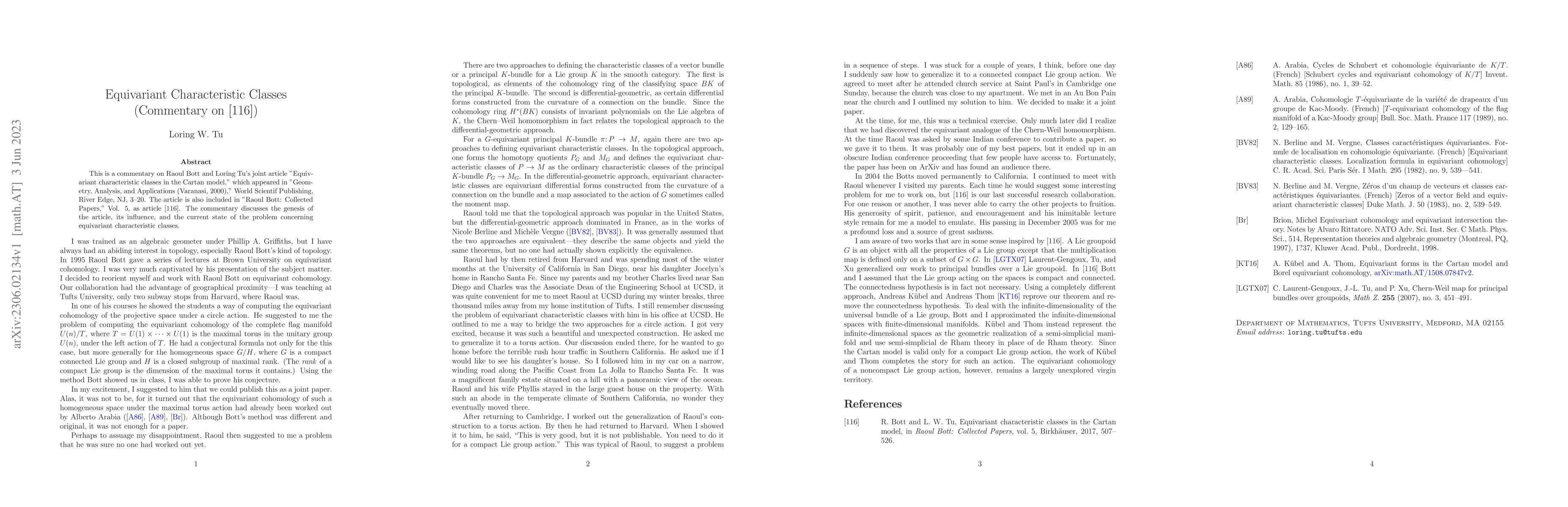 This commentary explores Raoul Bott and Loring Tu's seminal work on equivariant characteristic classes within the Cartan model, discussing its origins, impact, and the ongoing challenges in the field. The original article remains influential in advancing understanding of the subject.