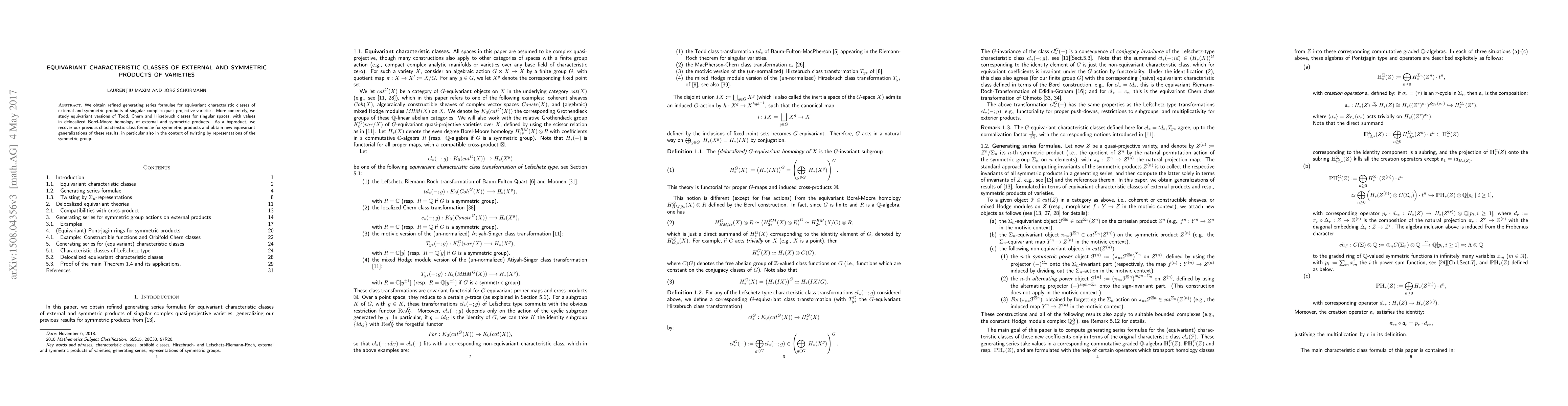 This research paper develops refined generating series formulae for equivariant characteristic classes of external and symmetric products of singular complex quasi-projective varieties, focusing on equivariant Todd, Chern, and Hirzebruch classes, and deriving new generalizations in the context of symmetric group representations.
