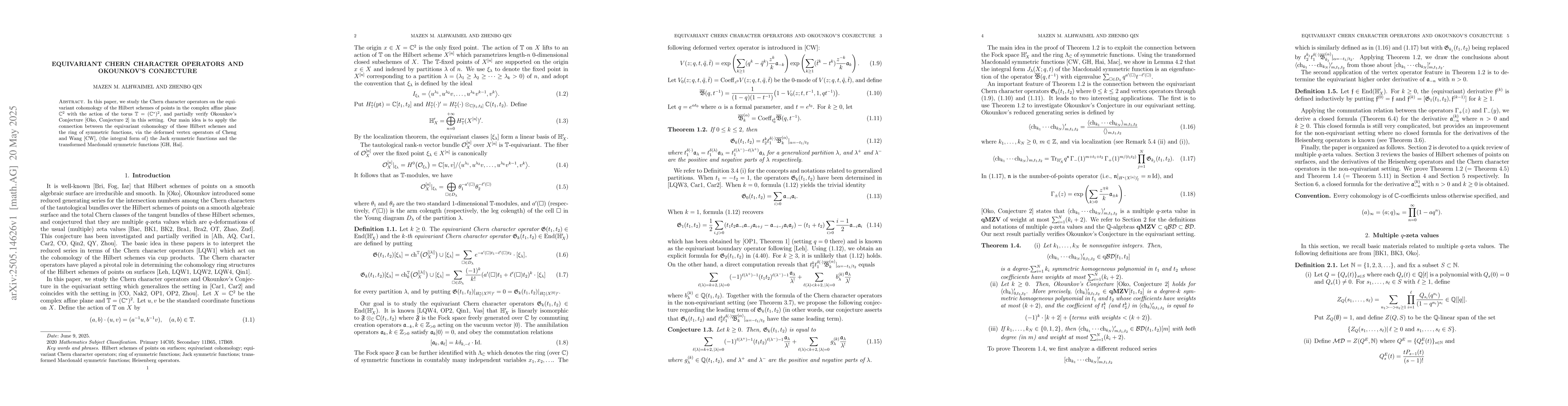 Development of a framework linking equivariant Chern character operators, Hilbert schemes, and symmetric functions, providing new insights into Okounkov's Conjecture.