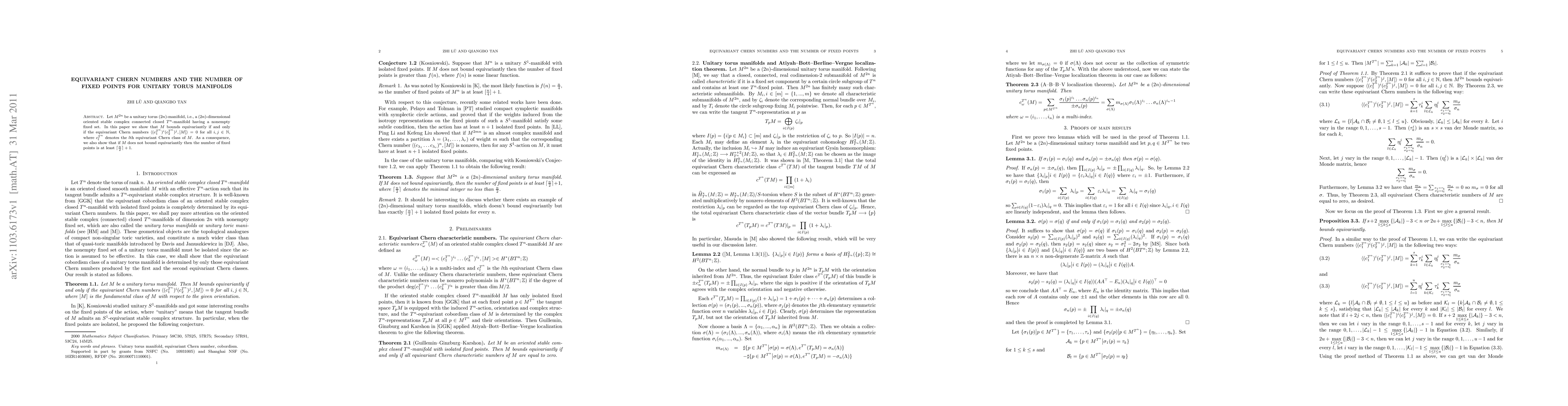 Let $M^{2n}$ be a unitary torus $(2n)$-manifold, i.e., a $(2n)$-dimensional oriented stable complex connected closed $T^n$-manifold having a nonempty fixed set. In this paper we show that $M$ bounds equivariantly if and only if the equivariant Chern numbers $< (c_1^{T^n})^i(c_2^{T^n})^j, [M]>=0$ for all $i, j\in {\Bbb N}$, where $c_l^{T^n}$ denotes the $l$th equivariant Chern class of $M$. As a consequence, we also show that if $M$ does not bound equivariantly then the number of fixed points is at least $\lceil{n\over2}\rceil+1$.