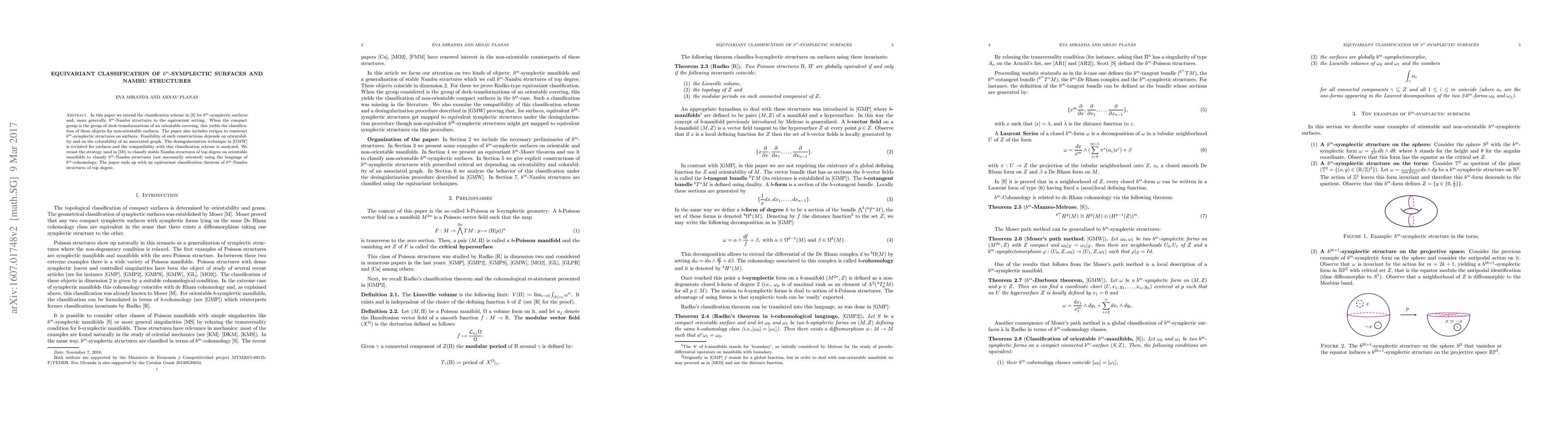 In this paper we extend the classification scheme in [S] for $b^m$-symplectic surfaces and, more generally, $b^m$-Nambu structures to the equivariant setting. When the compact group is the group of deck-transformations of an orientable covering, this yields the classification of these objects for non-orientable surfaces. The paper also includes recipes to construct $b^m$-symplectic structures on surfaces. Feasibility of such constructions depends on orientability and on the colorability of an associated graph. The desingularization technique in [GMW] is revisited for surfaces and the compatibility with this classification scheme is analyzed. We recast the strategy used in [Mt] to classify stable Nambu structures of top degree on orientable manifolds to classify $b^m$-Nambu structures (not necessarily oriented) using the language of $b^m$-cohomology. The paper ends up with an equivariant classification theorem of $b^m$-Nambu structures of top degree.