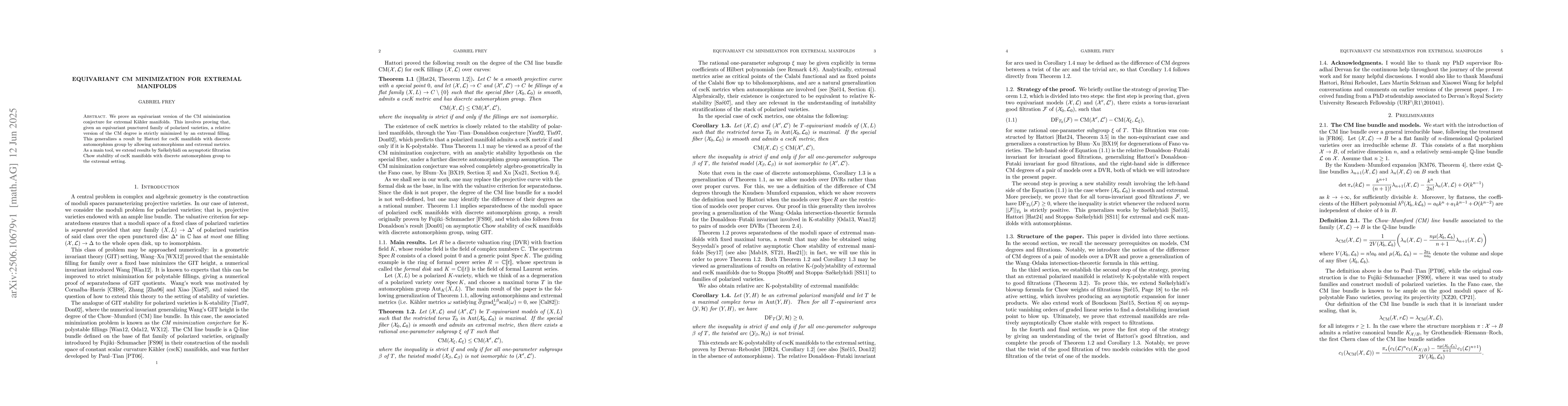 We prove an equivariant version of the CM minimization conjecture for extremal K\"ahler manifolds. This involves proving that, given an equivariant punctured family of polarized varieties, a relative version of the CM degree is strictly minimized by an extremal filling. This generalizes a result by Hattori for cscK manifolds with discrete automorphism group by allowing automorphisms and extremal metrics. As a main tool, we extend results by Sz\'ekelyhidi on asymptotic filtration Chow stability of cscK manifolds with discrete automorphism group to the extremal setting.