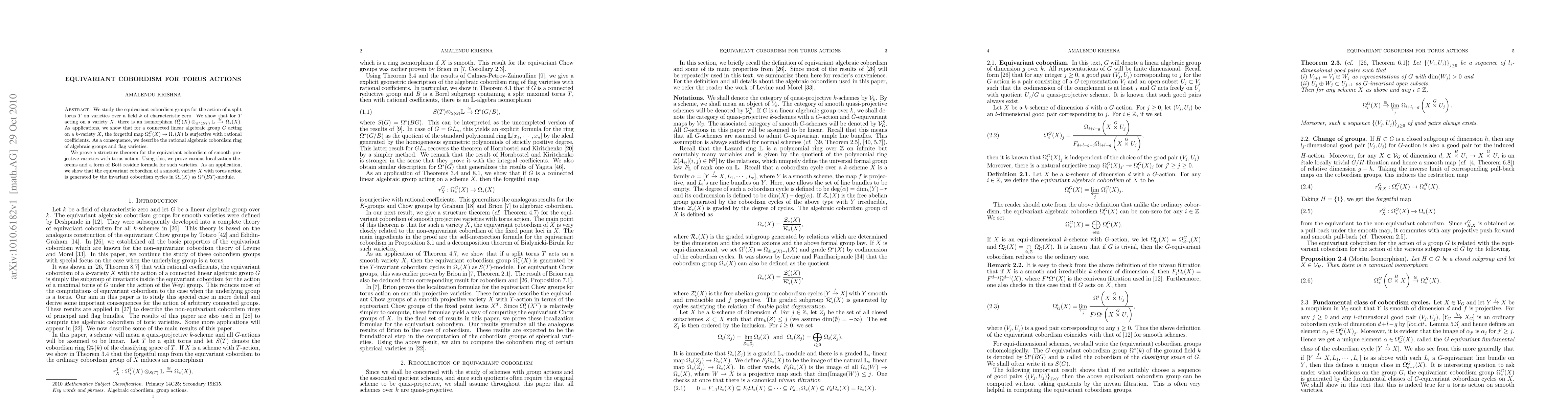 This paper investigates the equivariant cobordism theory for schemes under torus actions, deriving explicit relations between equivariant and ordinary cobordism, and establishing localization theorems to describe the structure of the ordinary cobordism ring for certain smooth projective varieties. Structure theorems for equivariant cobordism are also proven.