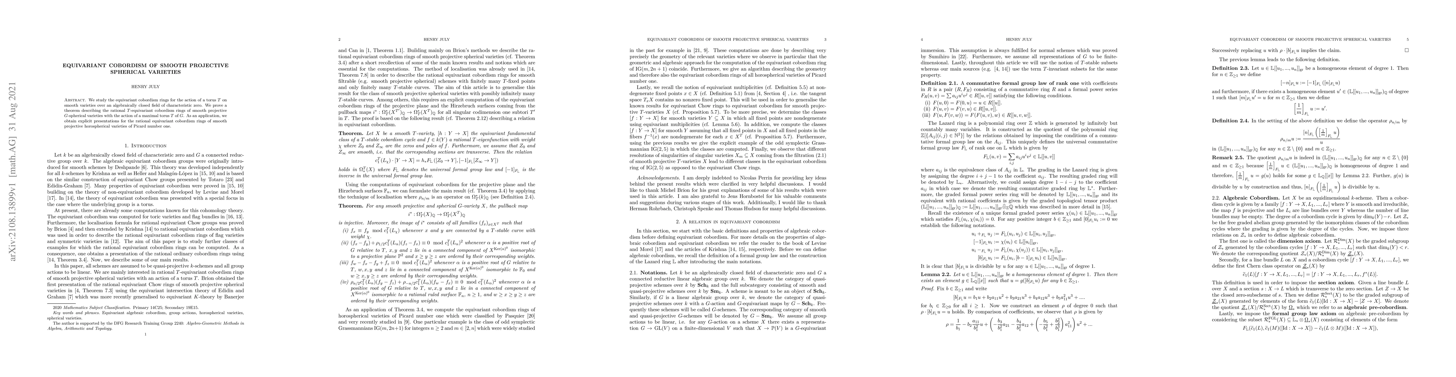 This paper investigates the equivariant cobordism rings of smooth projective spherical varieties under the action of a torus, proving a theorem that describes these rings for smooth projective $G$-spherical varieties. It provides explicit presentations for the rational equivariant cobordism rings of smooth projective horospherical varieties with Picard number one.