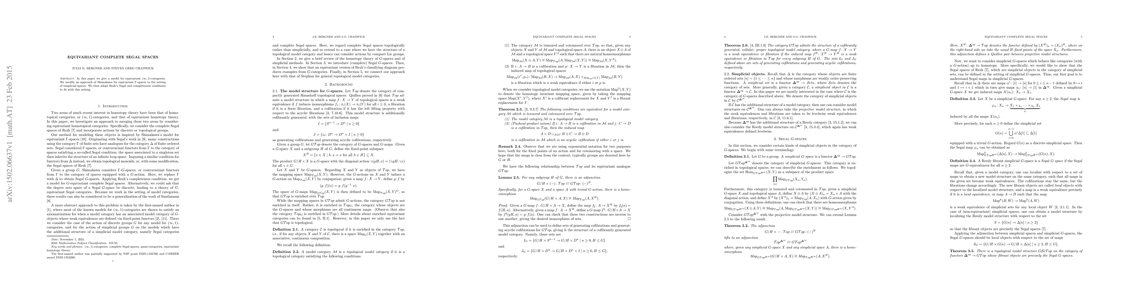 In this paper we give a model for equivariant $(\infty, 1)$-categories. We modify an approach of Shimakawa for equivariant $\Gamma$-spaces to the setting of simplicial spaces. We then adapt Rezk's Segal and completeness conditions to fit with this setting.