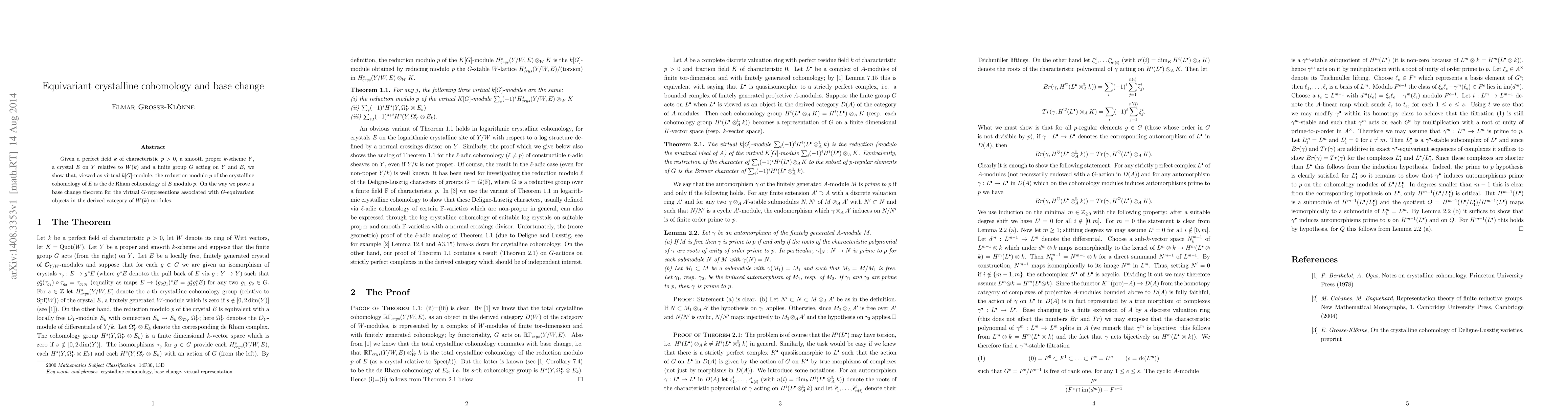 This paper demonstrates that the reduction modulo $p$ of crystalline cohomology for a crystal $E$ on a smooth proper $k$-scheme $Y$ is equivalent to the de Rham cohomology of $E$ modulo $p$, under a finite group $G$'s action. Additionally, it proves a base change theorem for virtual $G$-representations linked with $G$-equivariant objects in the derived category of $W(k)$-modules.
