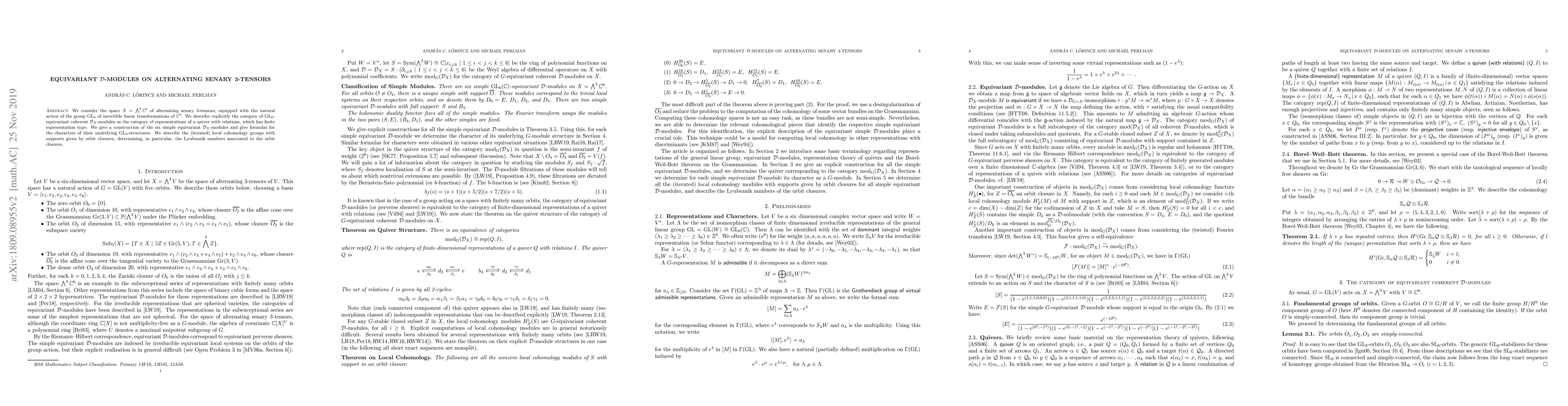 Let X be the third exterior power of a six-dimensional complex vector space, equipped with the natural action of the group GL_6(C) of invertible linear transformations of C^6. We describe explicitly the category of GL_6(C)-equivariant coherent D_X-modules as the category of representations of a quiver with relations, which has finite representation type. We give a construction of the six simple equivariant D_X-modules and give formulas for the characters of their underlying GL_6(C)-structures. We describe the (iterated) local cohomology groups with supports given by orbit closures, determining, in particular, the Lyubeznik numbers associated to the orbit closures.