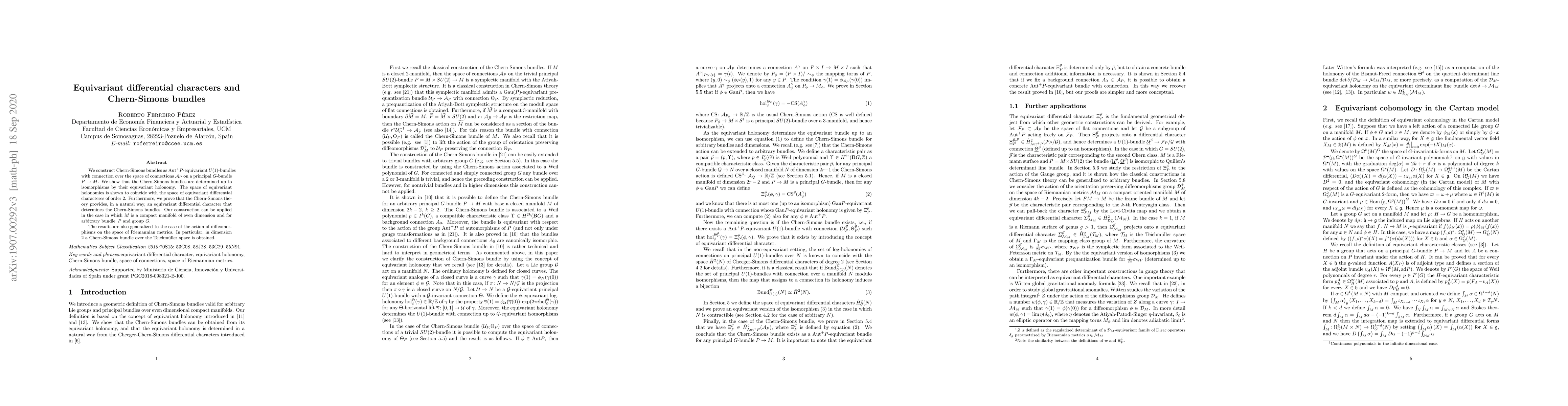 This paper constructs Chern-Simons bundles as equivariant $U(1)$-bundles over the space of connections on a principal $G$-bundle, showing they are determined by their equivariant holonomy. It establishes a connection between Chern-Simons bundles and equivariant differential characters of second order.