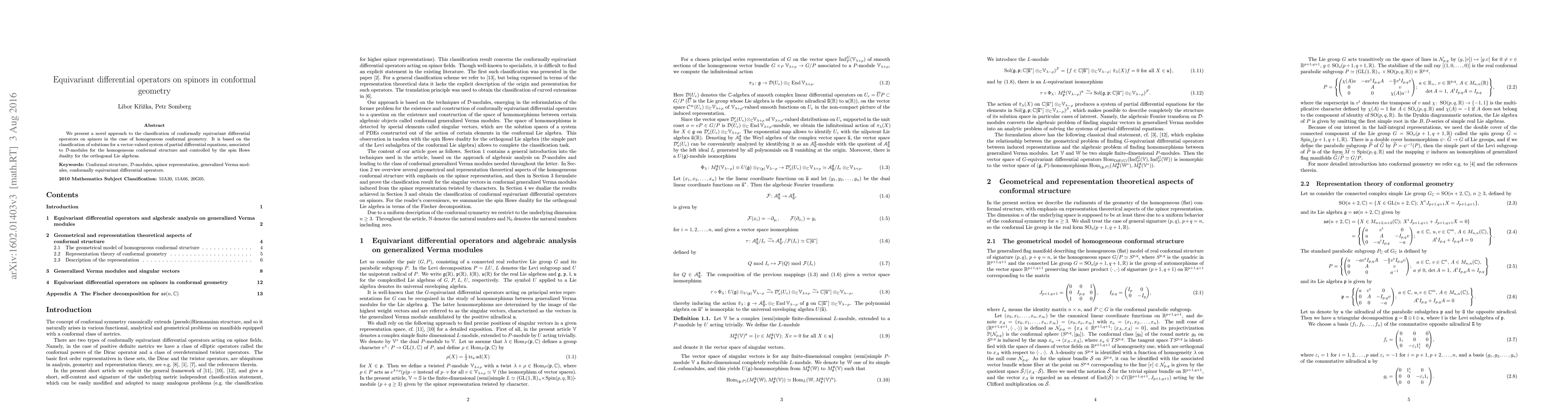 We present a novel approach to the classification of conformally equivariant differential operators on spinors in the case of homogeneous conformal geometry. It is based on the classification of solutions for a vector-valued system of partial differential equations, associated to $\mathcal{D}$-modules for the homogeneous conformal structure and controlled by the spin Howe duality for the orthogonal Lie algebras.