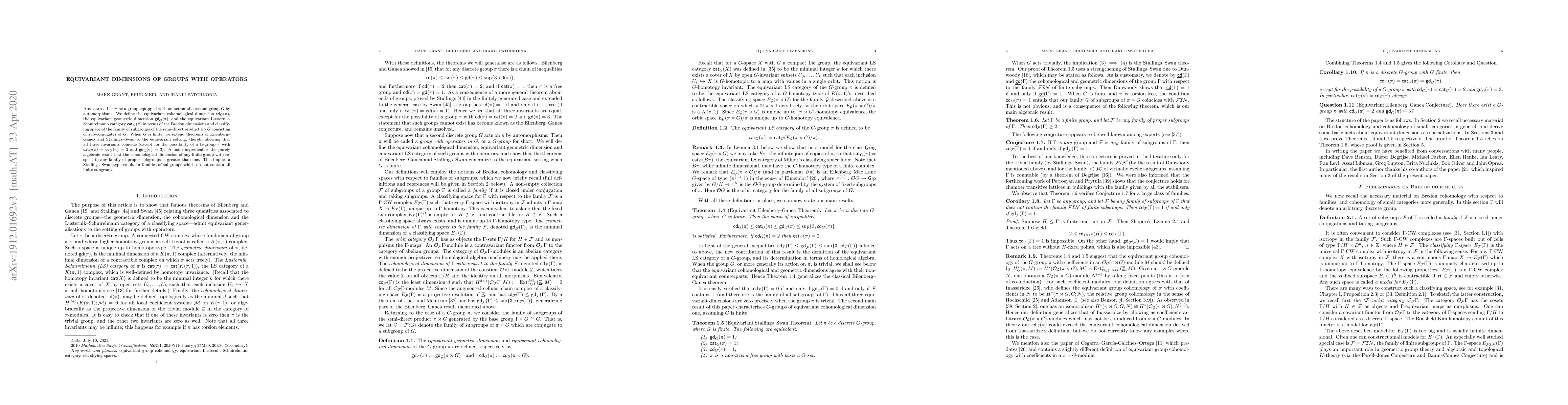 Researchers developed a framework to study equivariant dimensions of groups with operators, showing that certain invariants coincide under specific conditions, and providing a new approach to studying group actions.