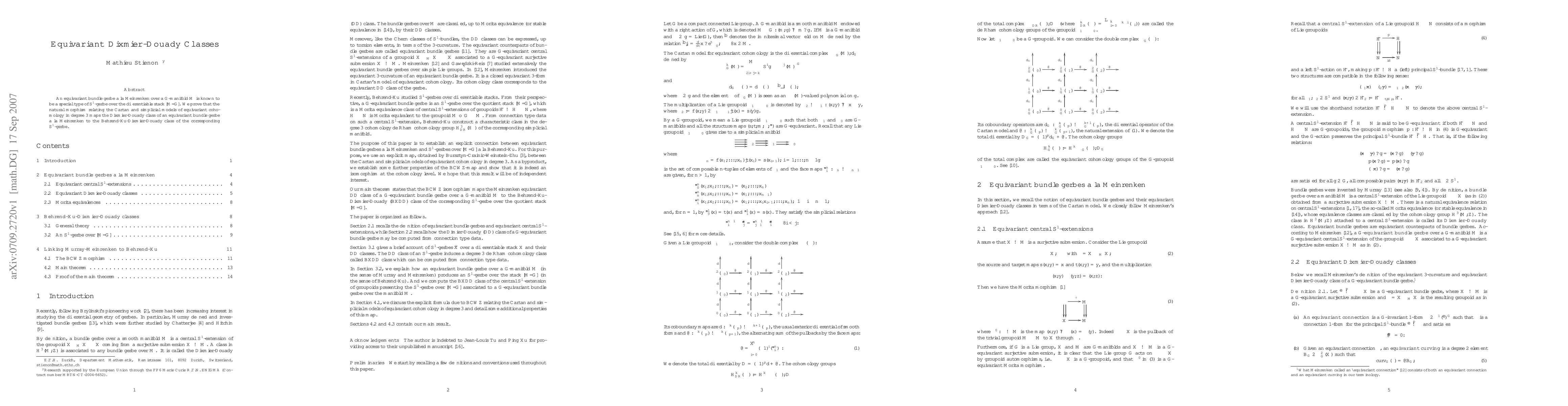 Summary: The paper establishes a relationship between equivariant bundle gerbes over $G$-manifolds and $S^1$-gerbes over the corresponding differentiable stack, proving that the Dixmier-Douady class in equivariant cohomology corresponds to the Behrend-Xu-Dixmier-Douady class for these gerbes.