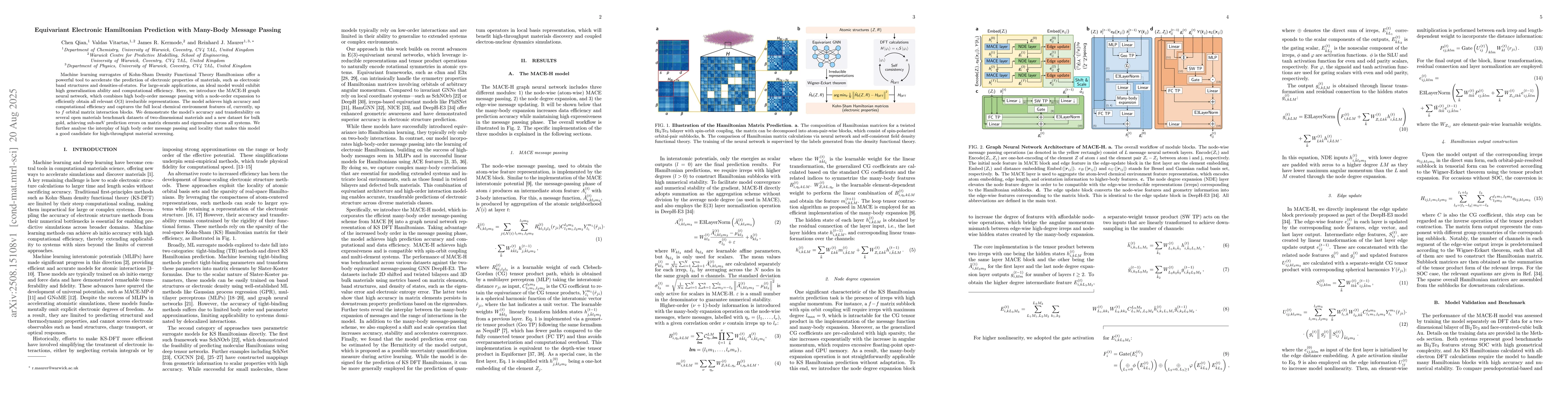Machine learning surrogates of Kohn-Sham Density Functional Theory Hamiltonians offer a powerful tool to accelerate the prediction of electronic properties of materials, such as electronic band structures and densities-of-states. For large-scale applications, an ideal model would exhibit high generalization ability and computational efficiency. Here, we introduce the MACE-H graph neural network, which combines high body-order message passing with a node-order expansion to efficiently obtain all relevant $O(3)$ irreducible representations. The model achieves high accuracy and computational efficiency and captures the full local chemical environment features of, currently, up to $f$ orbital matrix interaction blocks. We demonstrate the model's accuracy and transferability on several open materials benchmark datasets of two-dimensional materials and a new dataset for bulk gold, achieving sub-meV prediction errors on matrix elements and eigenvalues across all systems. We further analyse the interplay of high body order message passing and locality that makes this model a good candidate for high-throughput material screening.