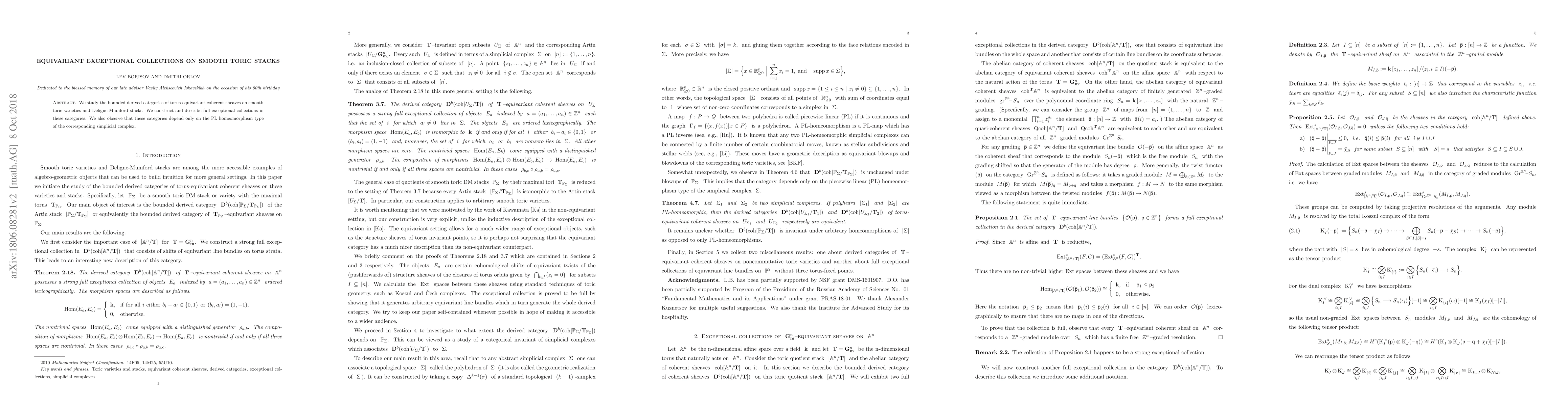 This paper constructs full equivariant exceptional collections in the derived categories of torus-equivariant coherent sheaves on smooth toric varieties and Deligne-Mumford stacks, noting that these categories are determined solely by the PL homeomorphism type of the underlying simplicial complexes.