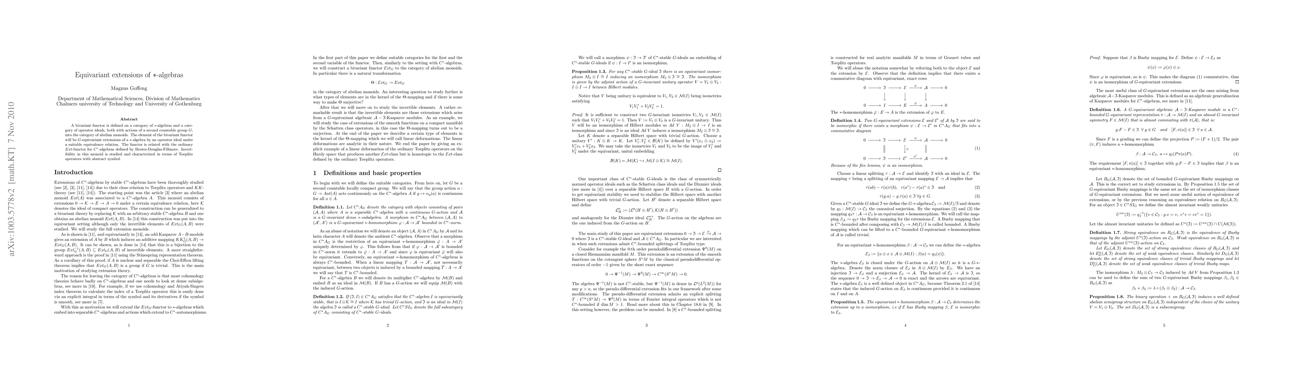 A bivariant functor is defined on a category of *-algebras and a category of operator ideals, both with actions of a second countable group $G$, into the category of abelian monoids. The element of the bivariant functor will be $G$-equivariant extensions of a *-algebra by an operator ideal under a suitable equivalence relation. The functor is related with the ordinary $Ext$-functor for $C^*$-algebras defined by Brown-Douglas-Fillmore. Invertibility in this monoid is studied and characterized in terms of Toeplitz operators with abstract symbol.
