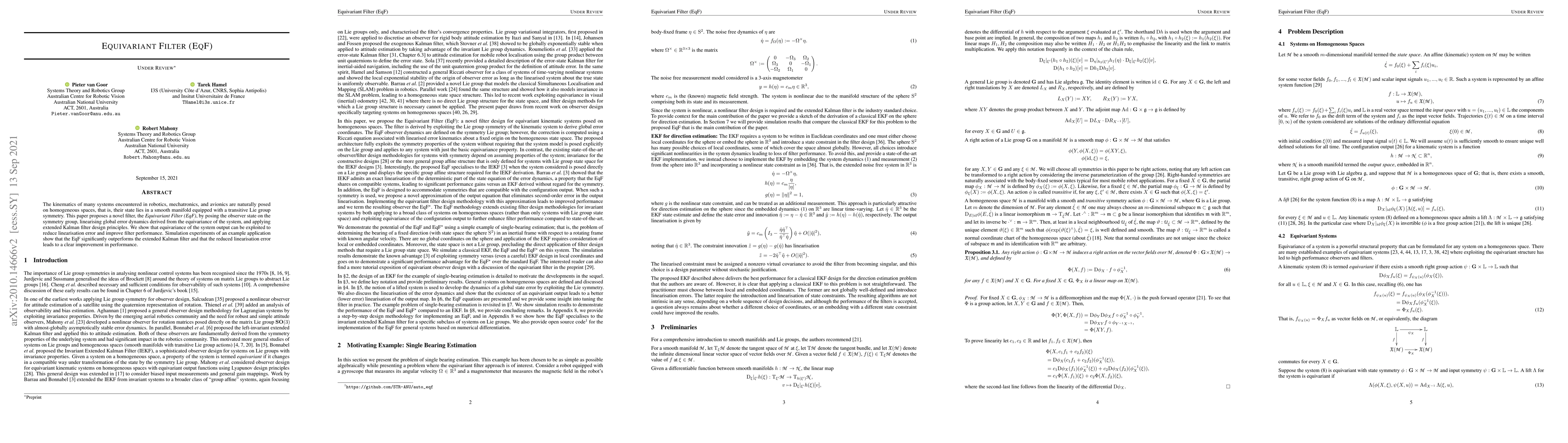 A new filter called Equivariant Filter (EqF) is proposed to improve performance in systems with symmetry, reducing linearisation error and outperforming traditional extended Kalman filters.