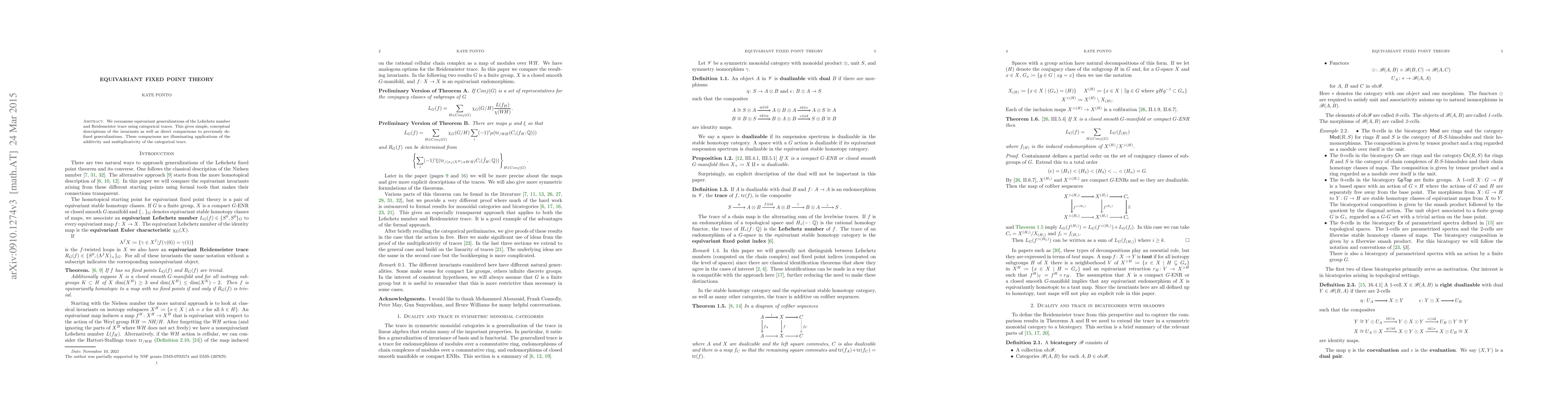 We reexamine equivariant generalizations of the Lefschetz number and Reidemeister trace using categorical traces. This gives simple, conceptual descriptions of the invariants as well as direct comparisons to previously defined generalizations. These comparisons are illuminating applications of the additivity and multiplicativity of the categorical trace.
