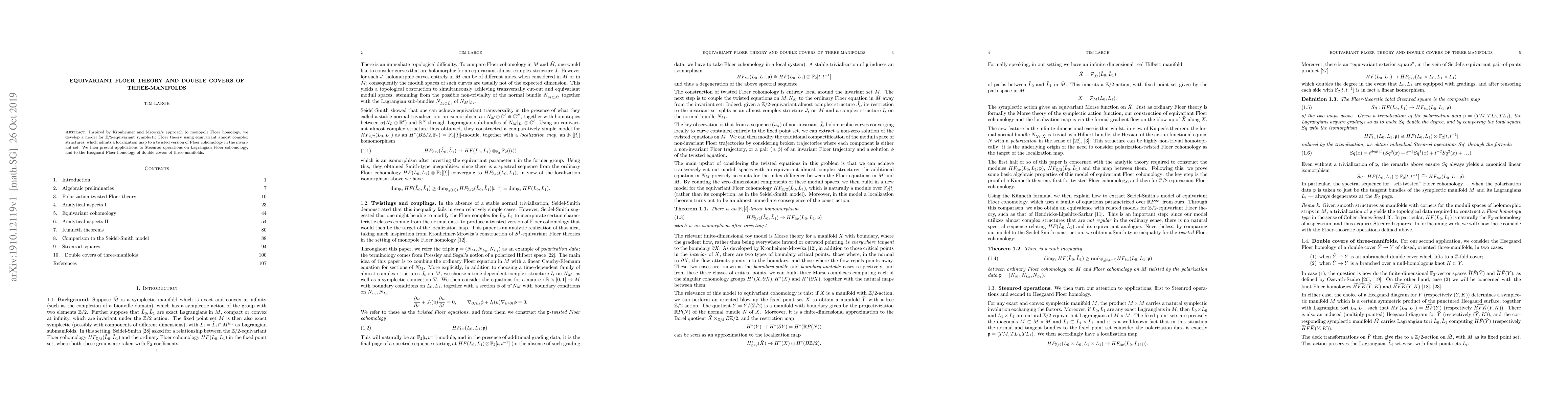 This paper develops $\mathbb{Z}/2$-equivariant symplectic Floer theory using equivariant almost complex structures, localizing to twisted Floer cohomology, and applies it to Steenrod operations and Heegaard Floer homology of double covers of three-manifolds.