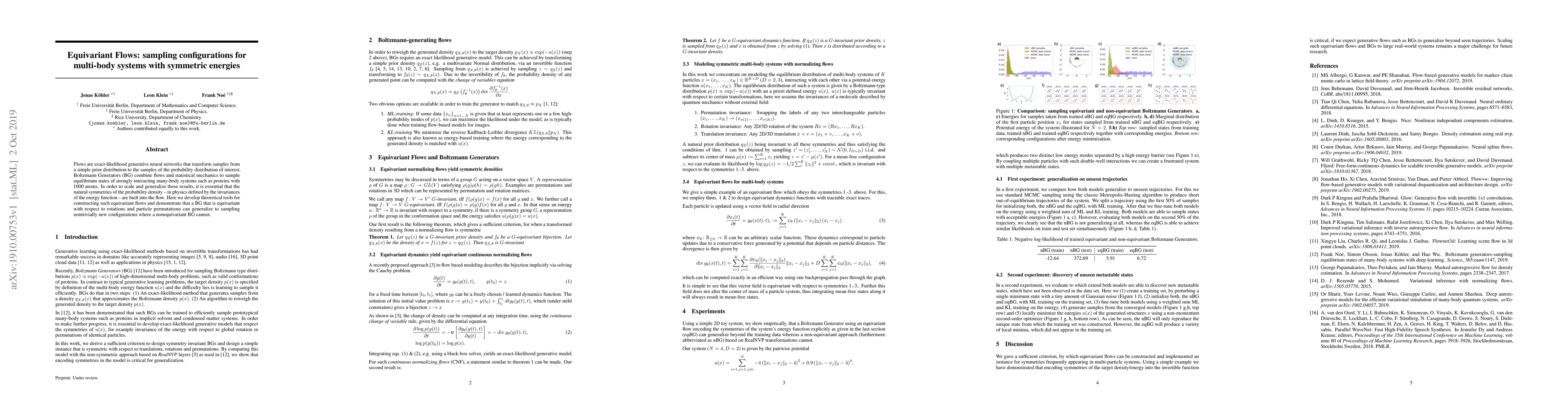Flows are exact-likelihood generative neural networks that transform samples from a simple prior distribution to the samples of the probability distribution of interest. Boltzmann Generators (BG) combine flows and statistical mechanics to sample equilibrium states of strongly interacting many-body systems such as proteins with 1000 atoms. In order to scale and generalize these results, it is essential that the natural symmetries of the probability density - in physics defined by the invariances of the energy function - are built into the flow. Here we develop theoretical tools for constructing such equivariant flows and demonstrate that a BG that is equivariant with respect to rotations and particle permutations can generalize to sampling nontrivially new configurations where a nonequivariant BG cannot.