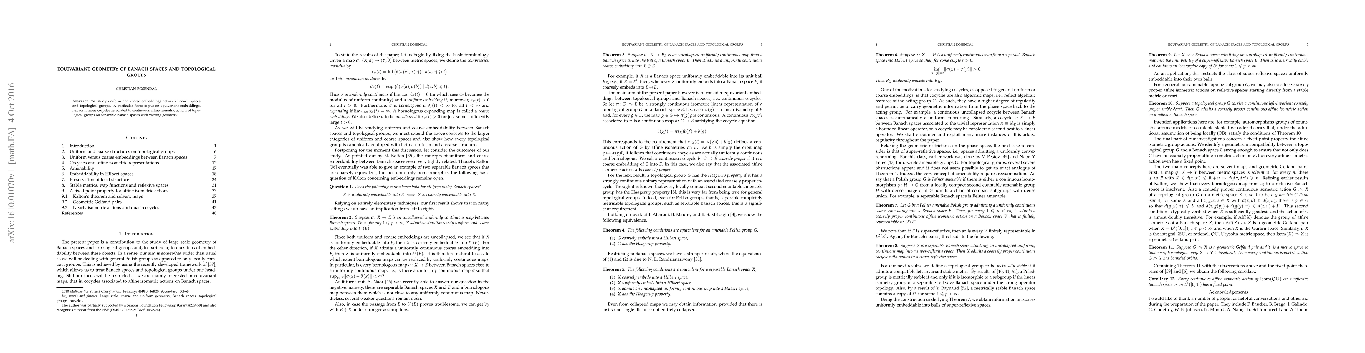 This paper investigates uniform and coarse embeddings between Banach spaces and topological groups, emphasizing equivariant embeddings that preserve the geometric and algebraic structures under continuous affine isometric actions of topological groups. The study highlights the interplay between equivariant embeddings and varying geometric properties of the spaces involved.