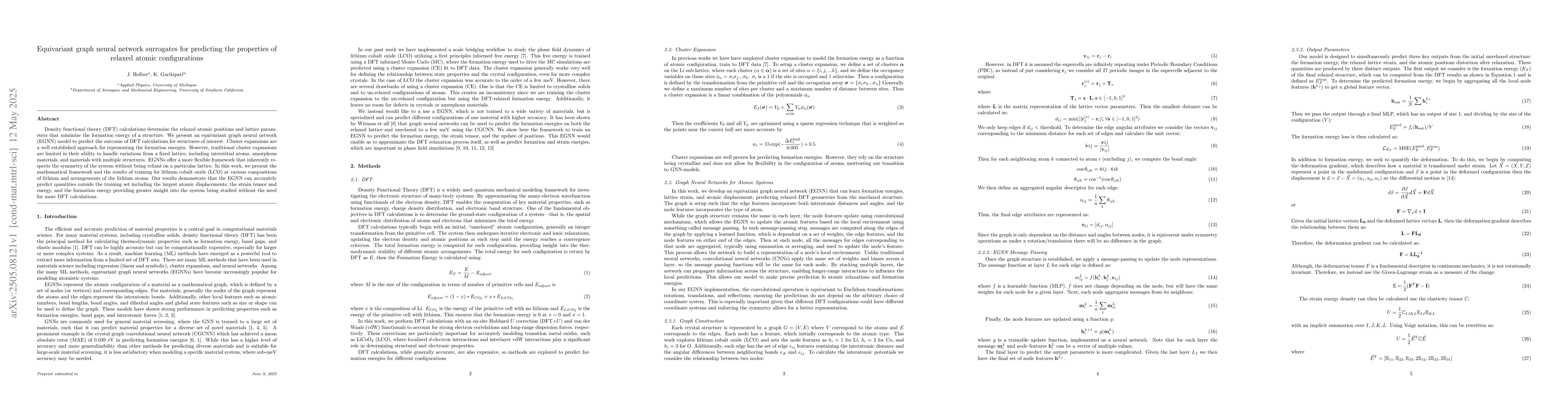 The development and application of an equivariant graph neural network (EGNN) for predicting DFT outcomes in relaxed atomic configurations, offering a symmetry-respecting, flexible alternative to traditional cluster expansions.