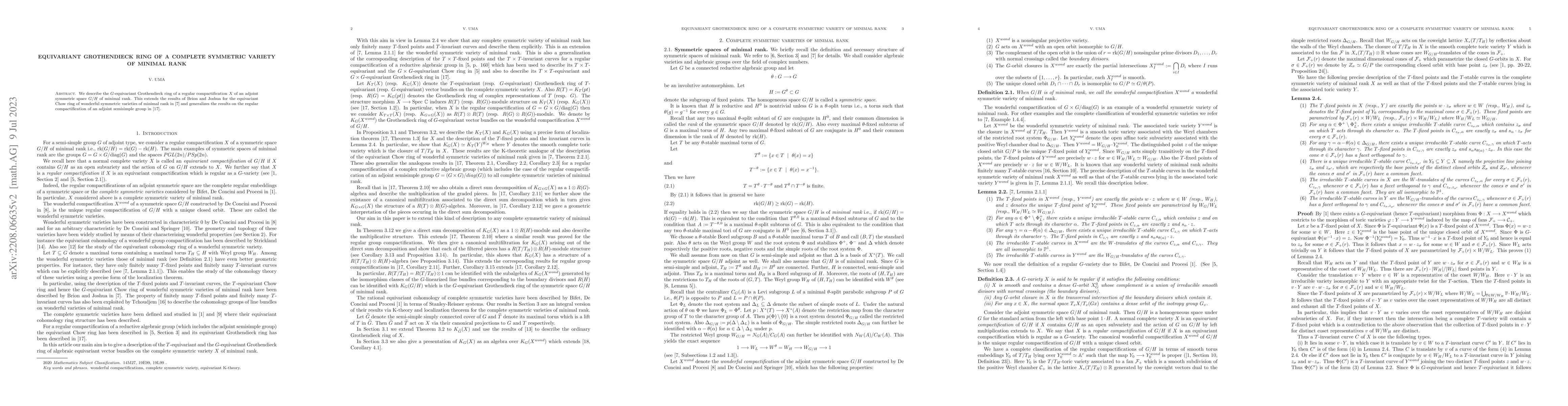 The paper presents a detailed description and characterization of the G-equivariant Grothendieck ring for regular compactifications of adjoint symmetric spaces of minimal rank, extending known results for wonderful symmetric varieties.