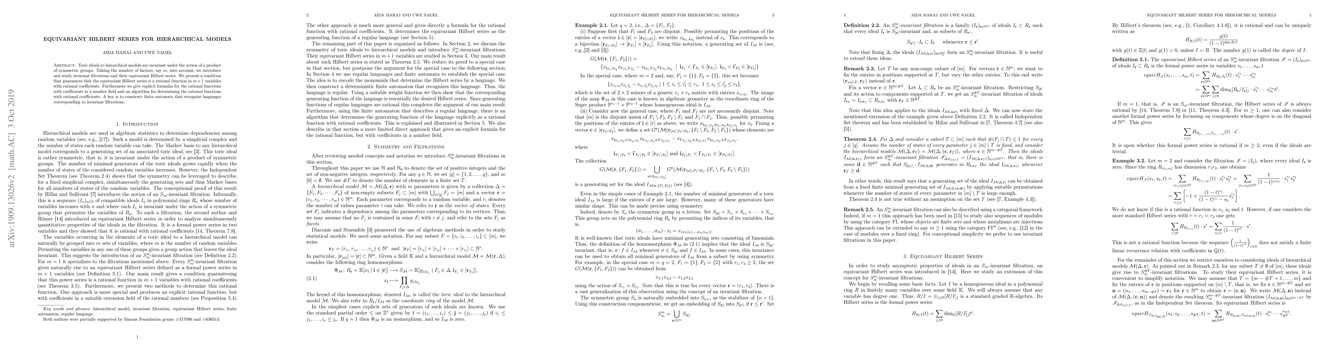 Toric ideals to hierarchical models are invariant under the action of a product of symmetric groups. Taking the number of factors, say m, into account, we introduce and study invariant filtrations and their equivariant Hilbert series. We present a condition that guarantees that the equivariant Hilbert series is a rational function in m+1 variables with rational coefficients. Furthermore we give explicit formulas for the rational functions with coefficients in a number field and an algorithm for determining the rational functions with rational coefficients. A key is to construct finite automata that recognize languages corresponding to invariant filtrations.