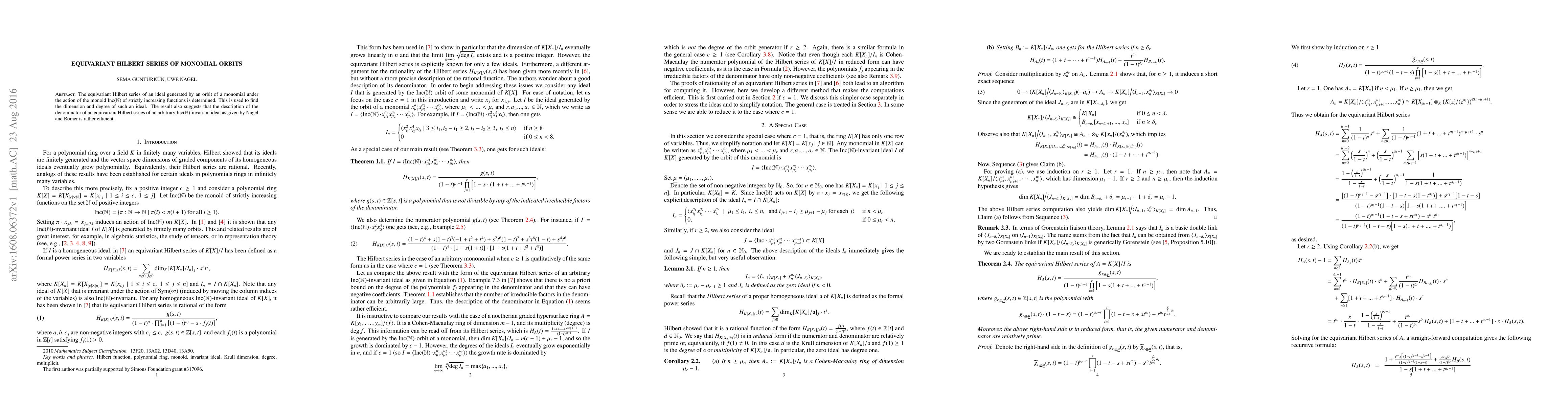 The equivariant Hilbert series of an ideal generated by an orbit of a monomial under the action of the monoid $\mbox{Inc}(\mathbb{N})$ of strictly increasing functions is determined. This is used to find the dimension and degree of such an ideal. The result also suggests that the description of the denominator of an equivariant Hilbert series of an arbitrary $\mbox{Inc}(\mathbb{N})$-invariant ideal as given by Nagel and R\"omer is rather efficient.