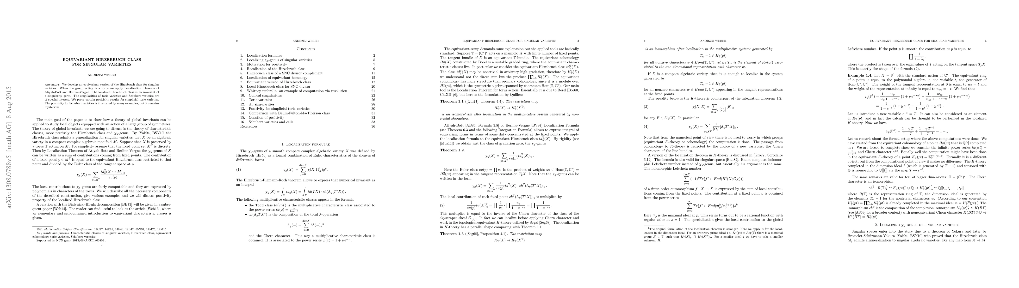 This paper develops the equivariant Hirzebruch class for singular complex algebraic varieties, utilizing tools like Atiyah-Segal localization and the Berline-Vergne formula. It reveals a meaningful singularity invariant expressed as a polynomial in torus characters, though the positivity of its coefficients remains an open question.