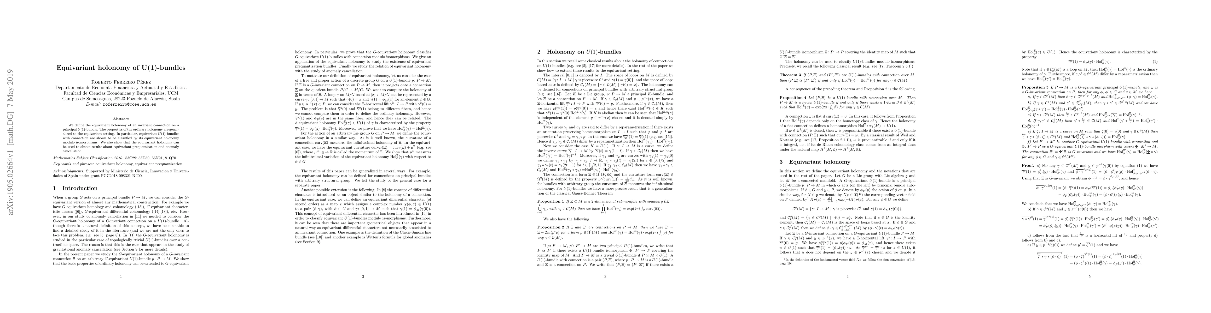 This paper defines the equivariant holonomy for invariant connections on principal U(1)-bundles and generalizes ordinary holonomy properties to this setting. It demonstrates that equivariant U(1)-bundles are classified by their equivariant holonomy and discusses applications to equivariant prequantization and anomaly cancellation.