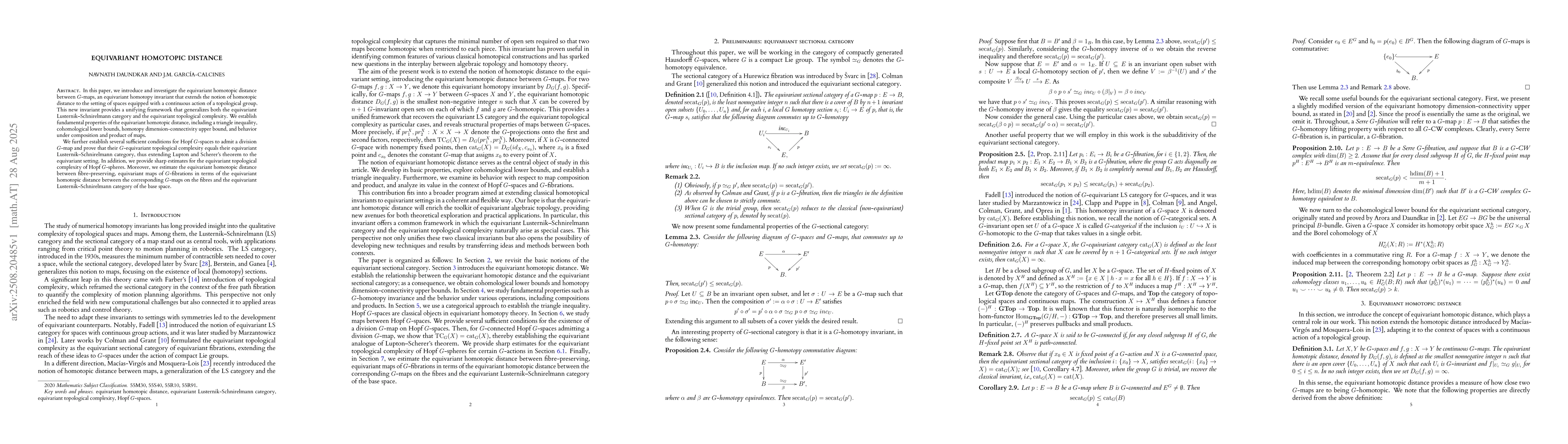 In this paper, we introduce and investigate the equivariant homotopic distance between G-maps, an equivariant homotopy invariant that extends the notion of homotopic distance to the setting of spaces equipped with a continuous action of a topological group. This new invariant provides a unifying framework that generalizes both the equivariant Lusternik-Schnirelmann category and the equivariant topological complexity. We establish fundamental properties of the equivariant homotopic distance, including a triangle inequality, cohomological lower bounds, homotopy dimension-connectivity upper bound, and behavior under composition and product of maps. We further establish several sufficient conditions for Hopf G-spaces to admit a division G-map and prove that their G-equivariant topological complexity equals their equivariant Lusternik-Schnirelmann category, thus extending Lupton and Scherer's theorem to the equivariant setting. In addition, we provide sharp estimates for the equivariant topological complexity of Hopf G-spheres. Moreover, we estimate the equivariant homotopic distance between fibre-preserving, equivariant maps of G-fibrations in terms of the equivariant homotopic distance between the corresponding G-maps on the fibres and the equivariant Lusternik-Schnirelmann category of the base space.