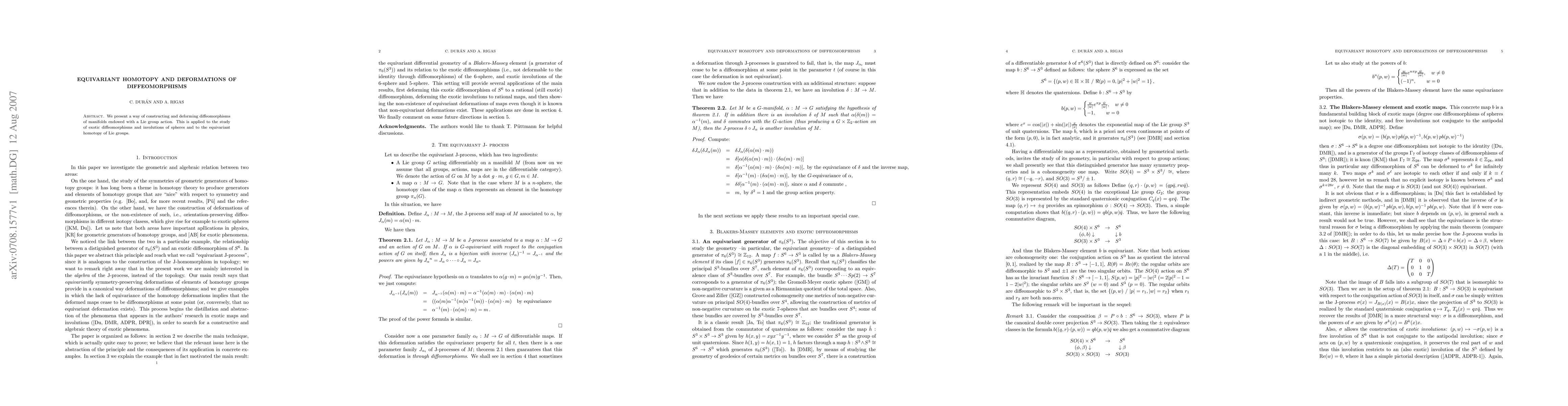 Summary: This paper constructs and deforms diffeomorphisms of manifolds under Lie group actions, applying the method to study exotic diffeomorphisms and involutions of spheres, and exploring the equivariant homotopy of Lie groups.