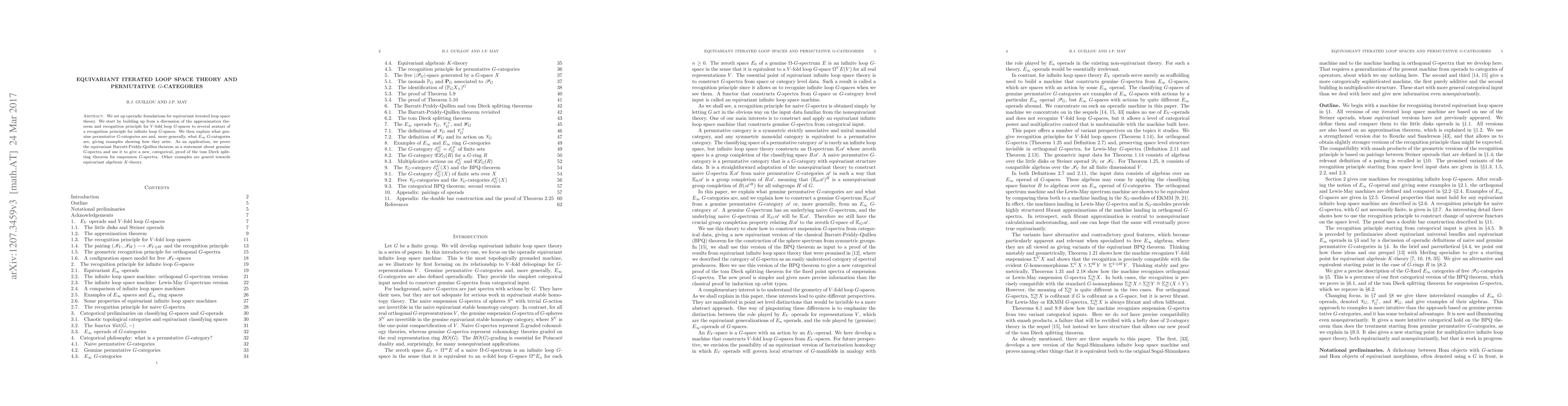 This paper establishes operadic foundations for equivariant iterated loop space theory, detailing recognition principles for loop G-spaces and defining genuine permutative G-categories and E_{\infty} G-categories with examples. It applies these definitions to prove the equivariant Barratt-Priddy-Quillen theorem and provides a new categorical proof of the tom Dieck splitting theorem for suspension G-spectra.