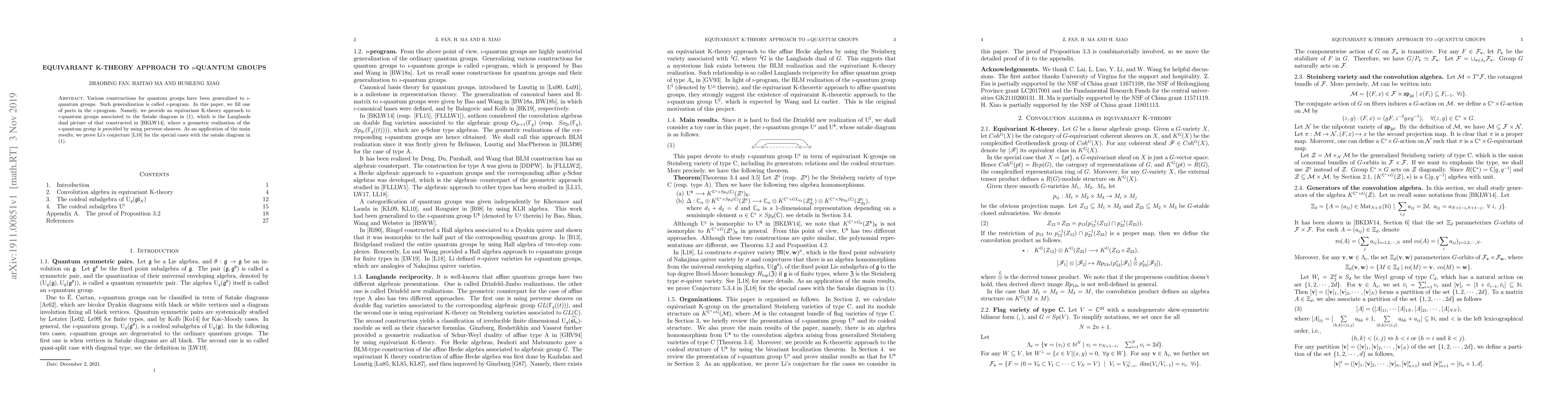 Various constructions for quantum groups have been generalized to $\imath$-quantum groups. Such generalization is called $\imath$-program. In this paper, we fill one of parts in the $\imath$-program. Namely, we provide an equivariant K-theory approach to $\imath$-quantum groups associated to the Satake diagram in \eqref{eq1}, which is the Langlands dual picture of that constructed in \cite{BKLW14}, where a geometric realization of the $\imath$-quantum group is provided by using perverse sheaves. As an application of the main results, we prove Li's conjecture \cite{L18} for the special cases with the satake diagram in \eqref{eq1}.