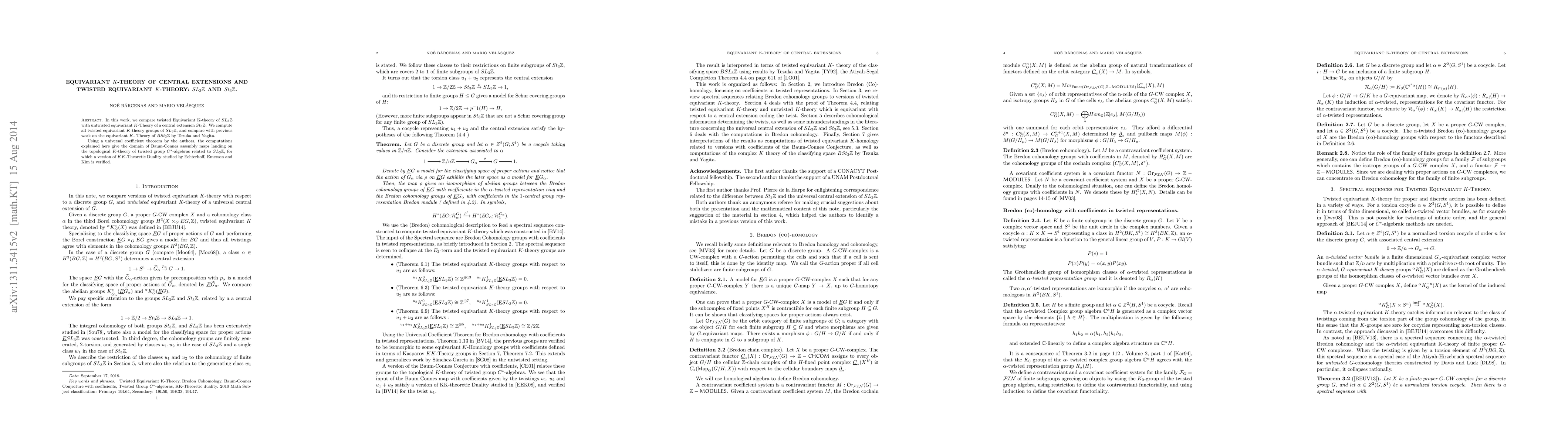 We compare twisted Equivariant K-theory of Sl3Z with untwisted equivariant K-Theory of its universal central extension, St3Z. Using universal coefficient theorems by the authors, the computations explained here give the domain of Baum-Connes assembly maps landing on the topological K-theory of twisted group C*-algebras related to Sl3Z, for which a version of Poincar\'e Duality studied previously by Echterhoff, Emerson and Kim is verified.