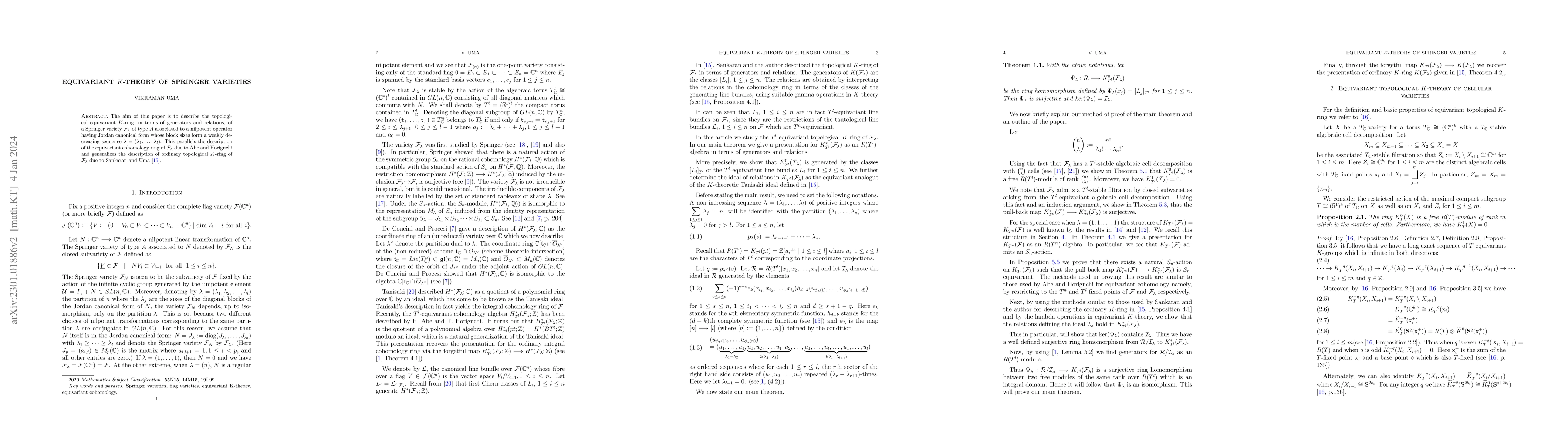 This paper presents the topological equivariant $K$-ring of a Springer variety $\mathcal{F}_{\lambda}$ in terms of generators and relations, generalizing previous descriptions of its equivariant cohomology and ordinary $K$-ring. It parallels the work of Abe and Horiguchi on the equivariant cohomology of $\mathcal{F}_{\lambda}$.