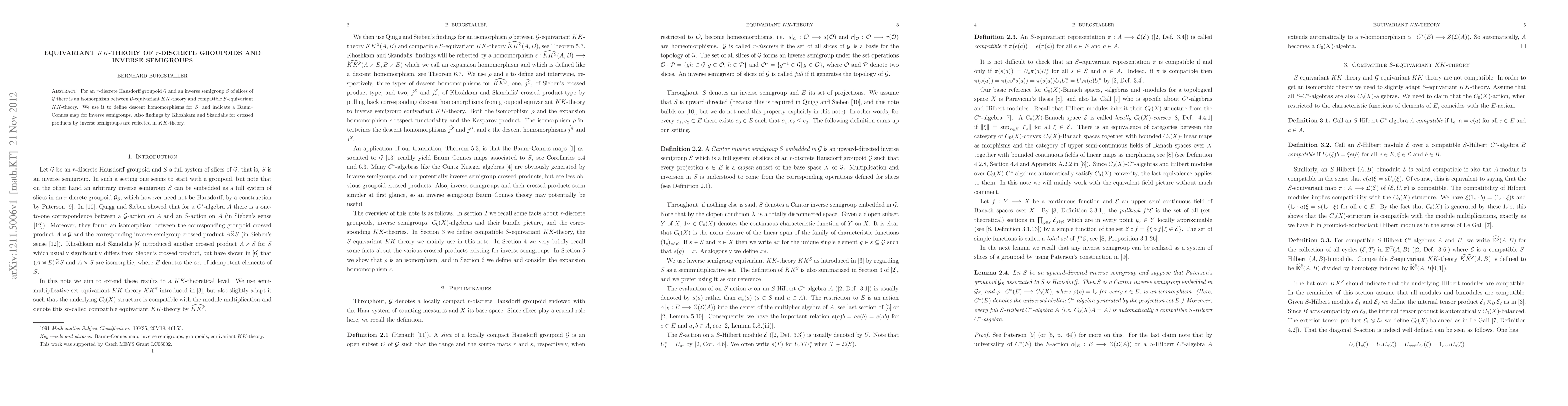 This paper establishes an isomorphism between the $G$-equivariant $KK$-theory and compatible $S$-equivariant $KK$-theory for an $r$-discrete Hausdorff groupoid ${\cal G}$ and its inverse semigroup $S$ of slices. It introduces descent homomorphisms for $S$ and discusses a Baum--Connes map for inverse semigroups, reflecting findings related to crossed products by inverse semigroups.