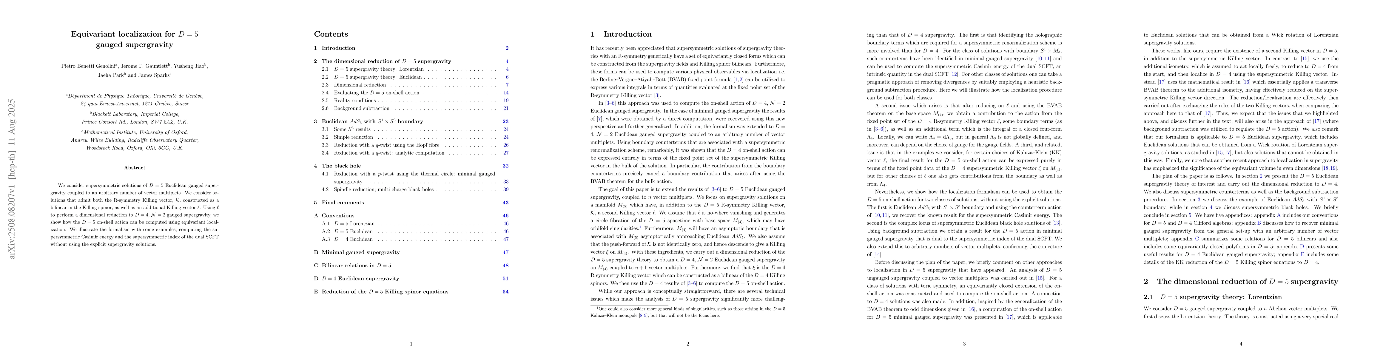 We consider supersymmetric solutions of $D=5$ Euclidean gauged supergravity coupled to an arbitrary number of vector multiplets. We consider solutions that admit both the R-symmetry Killing vector, $\mathcal{K}$, constructed as a bilinear in the Killing spinor, as well as an additional Killing vector $\ell$. Using $\ell$ to perform a dimensional reduction to $D=4$, $\mathcal{N}=2$ gauged supergravity, we show how the $D=5$ on-shell action can be computed using equivariant localization. We illustrate the formalism with some examples, computing the supersymmetric Casimir energy and the supersymmetric index of the dual SCFT without using the explicit supergravity solutions.