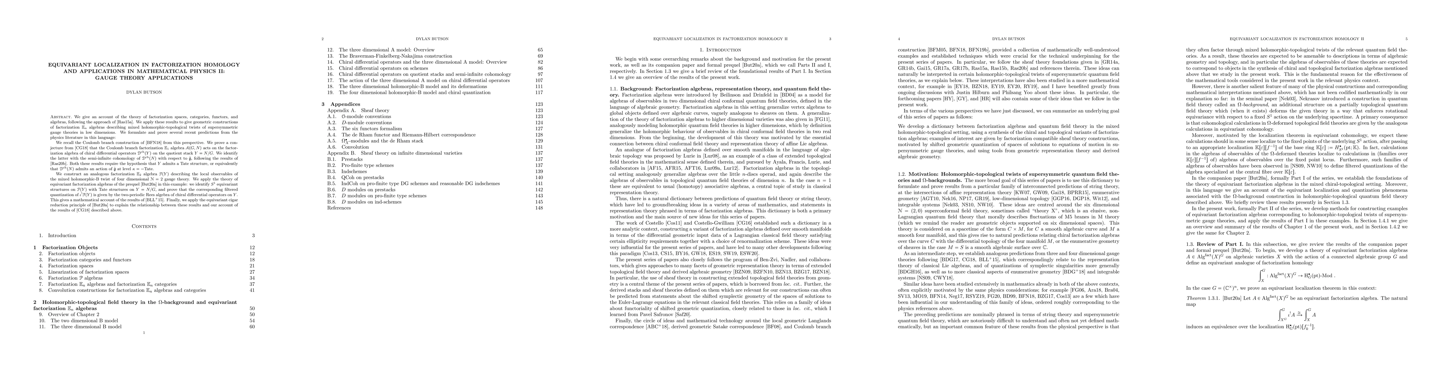We give an account of the theory of factorization spaces, categories, functors, and algebras, following the approach of [Ras1]. We apply these results to give geometric constructions of factorization $\mathbb{E}_n$ algebras describing mixed holomorphic-topological twists of supersymmetric gauge theories in low dimensions. We formulate and prove several recent predictions from the physics literature in this language: We recall the Coulomb branch construction of [BFN1] from this perspective. We prove a conjecture from [CosG] that the Coulomb branch factorization $\mathbb{E}_1$ algebra $\mathcal{A}(G,N)$ acts on the factorization algebra of chiral differential operators $\mathcal{D}^{ch}(Y)$ on the quotient stack $Y=N/G$. We identify the latter with the semi-infinite cohomology of $\mathcal{D}^{ch}(N)$ with respect to $\hat{\mathfrak{g}}$, following the results of [Ras3]. Both these results require the hypothesis that $Y$ admits a Tate structure, or equivalently that $\mathcal{D}^{ch}(N)$ admits an action of $\hat{\mathfrak{g}}$ at level $\kappa=-\text{Tate}$. We construct an analogous factorization $\mathbb{E}_2$ algebra $\mathcal{F}(Y)$ describing the local observables of the mixed holomorphic-B twist of four dimensional $\mathcal{N}=2$ gauge theory. We apply the theory of equivariant factorization algebras of the prequel [Bu1] in this example: we identify $S^1$ equivariant structures on $\mathcal{F}(Y)$ with Tate structures on $Y=N/G$, and prove that the corresponding filtered quantization of $\iota^!\mathcal{F}(Y)$ is given by the two-periodic Rees algebra of chiral differential operators on $Y$. This gives a mathematical account of the results of [Beem4]. Finally, we apply the equivariant cigar reduction principle of [Bu1] to explain the relationship between these results and our account of the results of [CosG] described above.