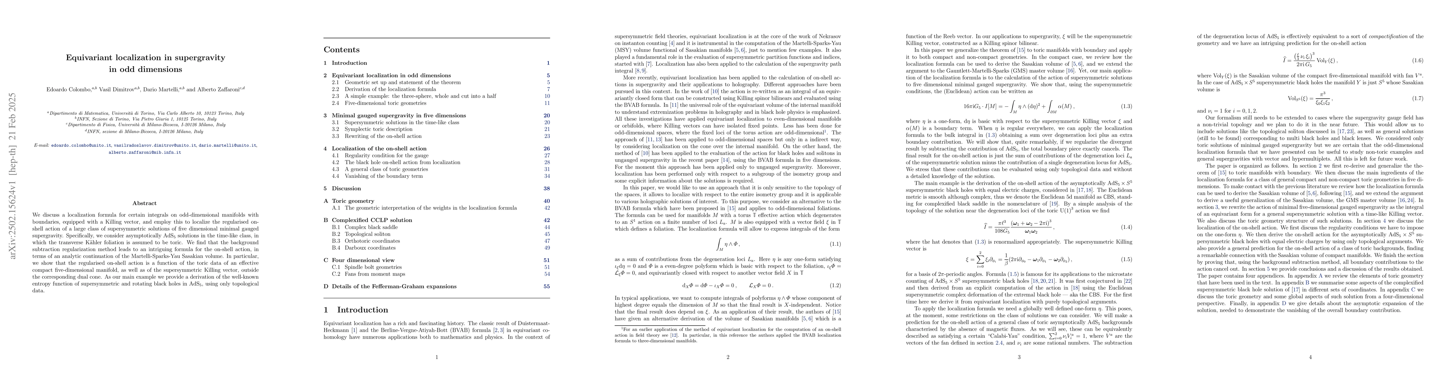 The paper presents an equivariant localization formula for odd-dimensional manifolds with Killing vectors, applied to supersymmetric solutions in five-dimensional minimal gauged supergravity.