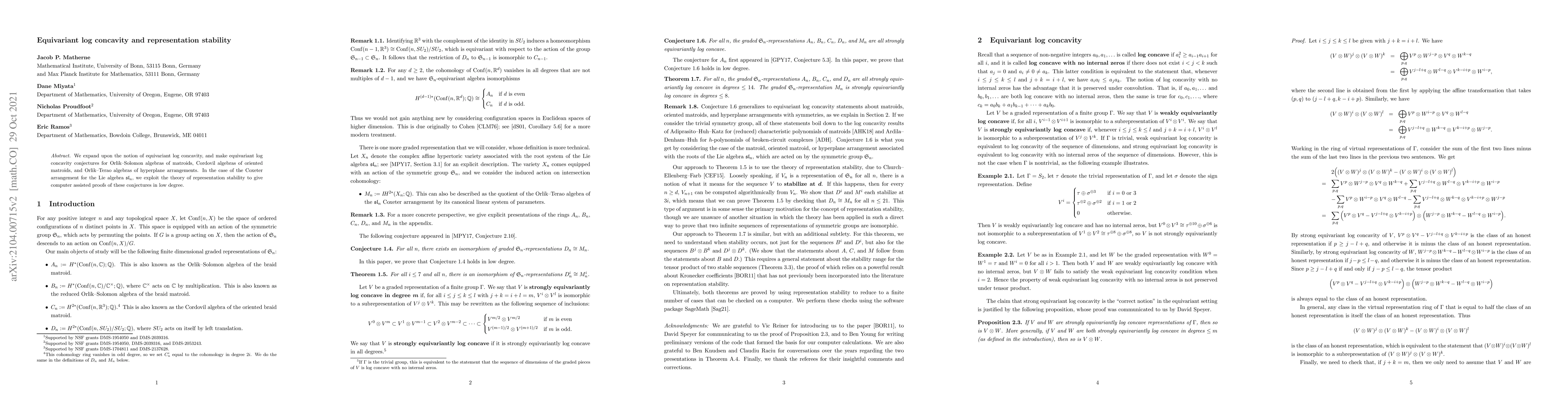 We expand upon the notion of equivariant log concavity, and make equivariant log concavity conjectures for Orlik--Solomon algebras of matroids, Cordovil algebras of oriented matroids, and Orlik--Terao algebras of hyperplane arrangements. In the case of the Coxeter arrangement for the Lie algebra $\mathfrak{sl}_n$, we exploit the theory of representation stability to give computer assisted proofs of these conjectures in low degree.