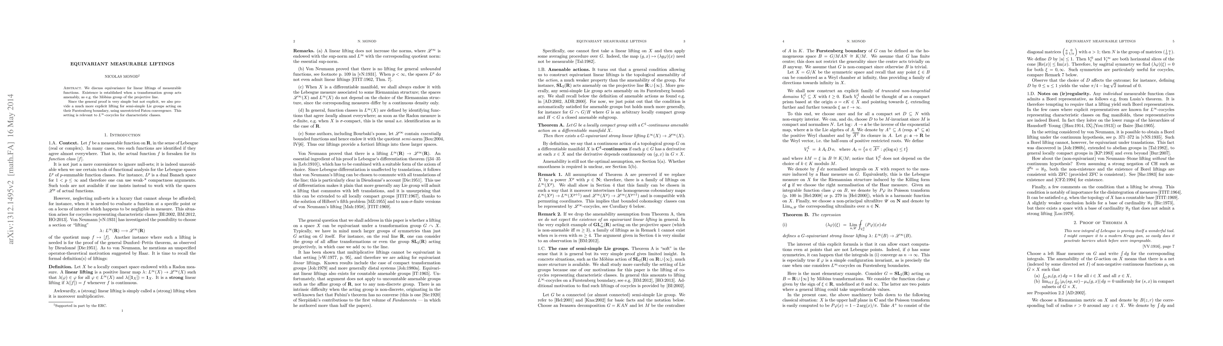 We discuss equivariance for linear liftings of measurable functions. Existence is established when a transformation group acts amenably, as e.g. the Moebius group of the projective line. Since the general proof is very simple but not explicit, we also provide a much more explicit lifting for semi-simple Lie groups acting on their Furstenberg boundary, using unrestricted Fatou convergence. This setting is relevant to cocycles for characteristic classes.