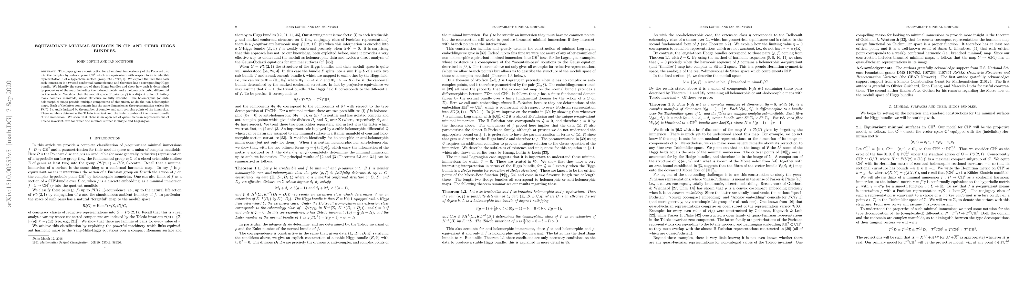 This paper gives a construction for all minimal immersions $f$ of the Poincar\'{e} disc into the complex hyperbolic plane $\mathbb{CH}^2$ which are equivariant with respect to an irreducible representation $\rho$ of a hyperbolic surface group into $PU(2,1)$. We exploit the fact that each such immersion is a twisted conformal harmonic map and therefore has a corresponding Higgs bundle. We identify the structure of these Higgs bundles and show how each is determined by properties of the map, including the induced metric and a holomorphic cubic differential on the surface. We show that the moduli space of pairs $(\rho,f)$ is a disjoint union of finitely many complex manifolds, whose structure we fully describe. The holomorphic (or anti-holomorphic) maps provide multiple components of this union, as do the non-holomorphic maps. Each of the latter components has the same dimension as the representation variety for $PU(2,1)$, and is indexed by the number of complex and anti-complex points of the immersion. These numbers determine the Toledo invariant and the Euler number of the normal bundle of the immersion. We show that there is an open set of quasi-Fuchsian representations of Toledo invariant zero for which the minimal surface is unique and Lagrangian.