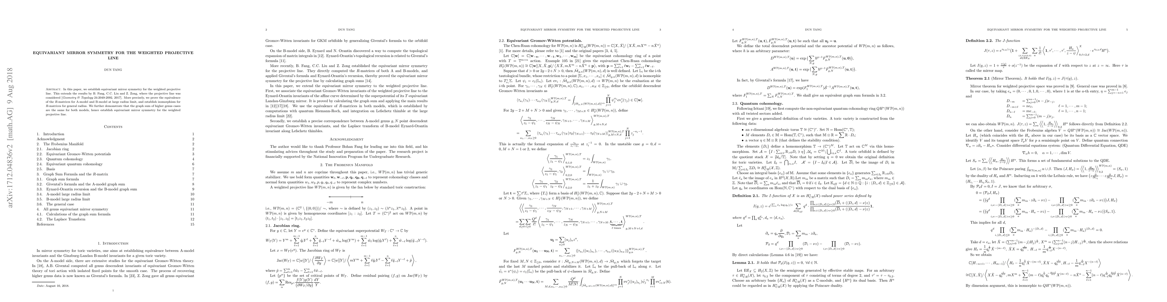 This paper establishes equivariant mirror symmetry for the weighted projective line by proving the equivalence of A-model and B-model $R$-matrices and demonstrating identical graph sums for higher genus cases, extending prior results for the projective line.